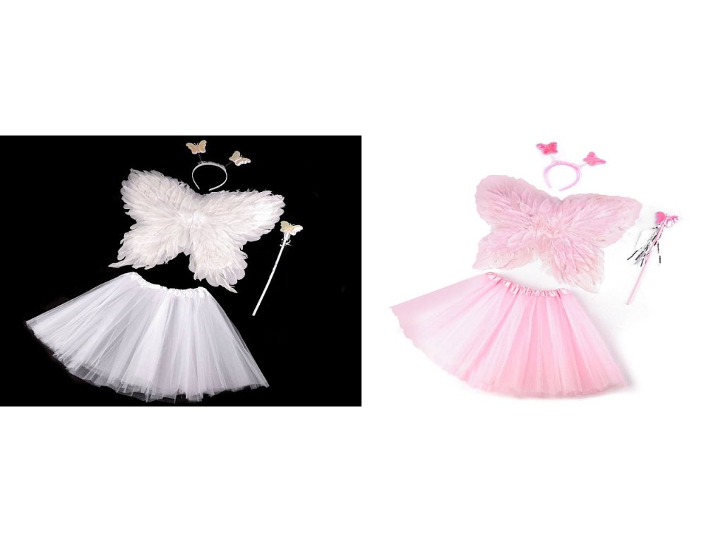 Sukýnka je v pase je pružná. Křídla jsou oboustranná, bohatě pokrytá peřím, nasazují se pomocí gumiček. Na čelence najdete motýlky na pružinkách.