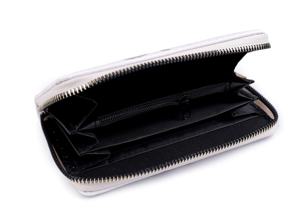 Peněženka obsahuje jednu hlavní kapsu, která se zapíná na kovový zip. Uvnitř je peněženka členěná do tří velkých přihrádek na papírové bankovky a jedné uzavíratelné kapsy na zip, vhodné k ukládání mincí a různých drobností. Po vnitřních stranách peněženky je rozmístěno šest přihrádek na karty, doklady, účtenky apod.