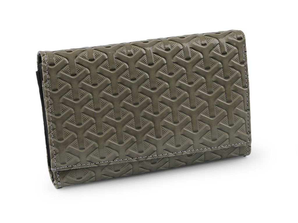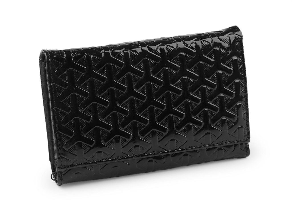 Zavírá se na klopu a patent. Uvnitř jsou 2 oddělené prostory. Po pravé straně jsou 4 přihrádky na karty, z toho je 1 průhledná. Pod nimi je 1 velká plochá kapsa. Uprostřed peněženky se nachází 2 kapsy na bankovky, v jedné je malá kapsička na zip. Vlevo je mincovník, který se zapíná na zip. Peněženka ukrývá ještě druhý oddíl, který se objeví po odepnutí zápinky na levé straně. Zde se nachází 6 přihrádek na kreditní karty a 5 plochých kapes.