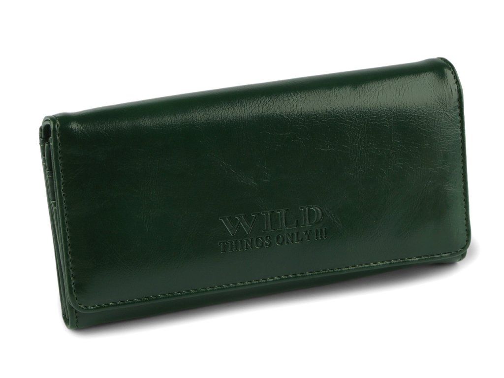 Zavírá se na klopu a patent. Peněženka má celkem 9 přihrádek na karty, z nichž jedna je průhledná. Uprostřed peněženky se nachází 3 kapsy na bankovky, oddělené přepážkami. V jedné přepážce je umístěná kapsa na zip. Vlevo je mincovník, který má kovové zapínání.
