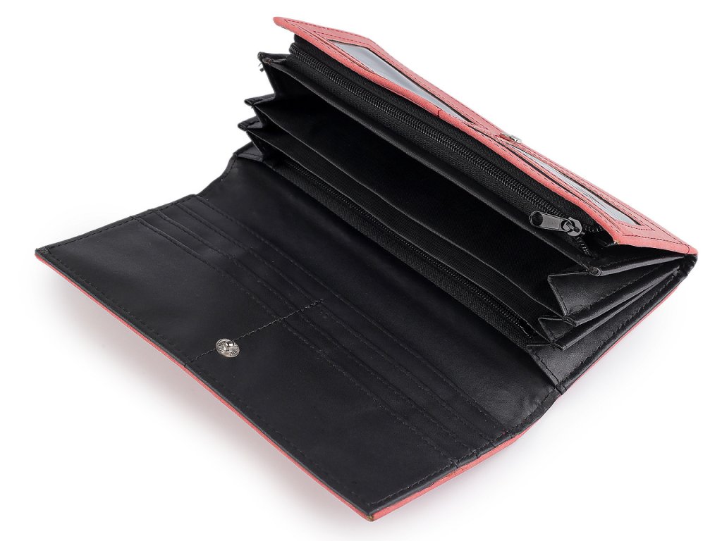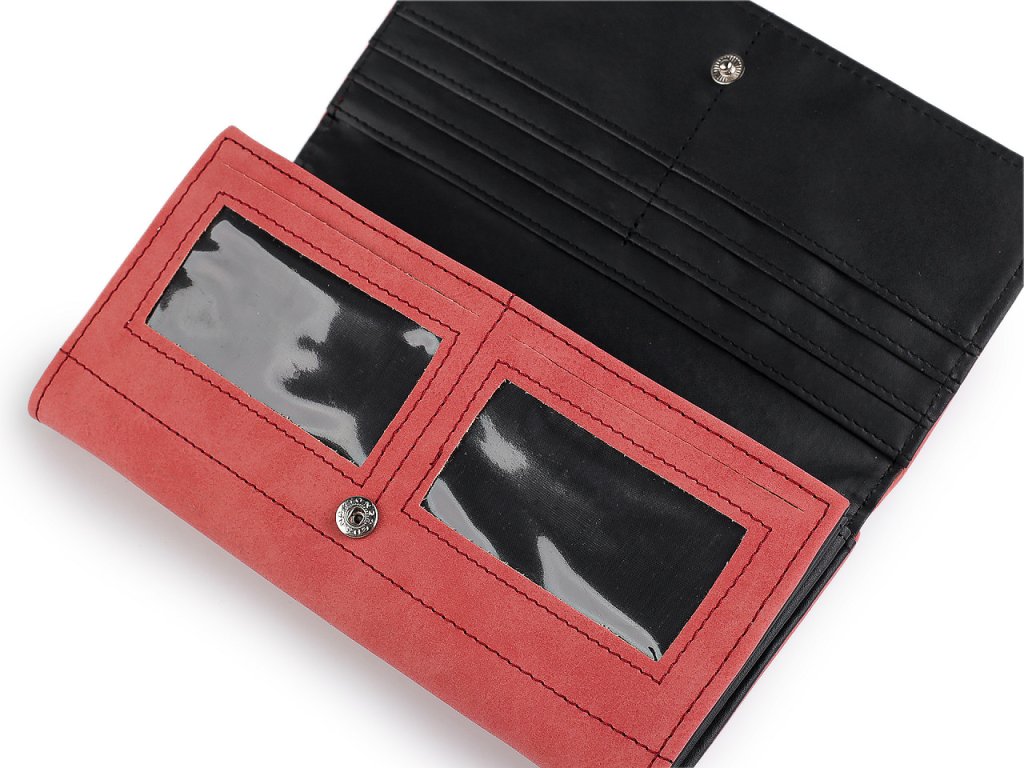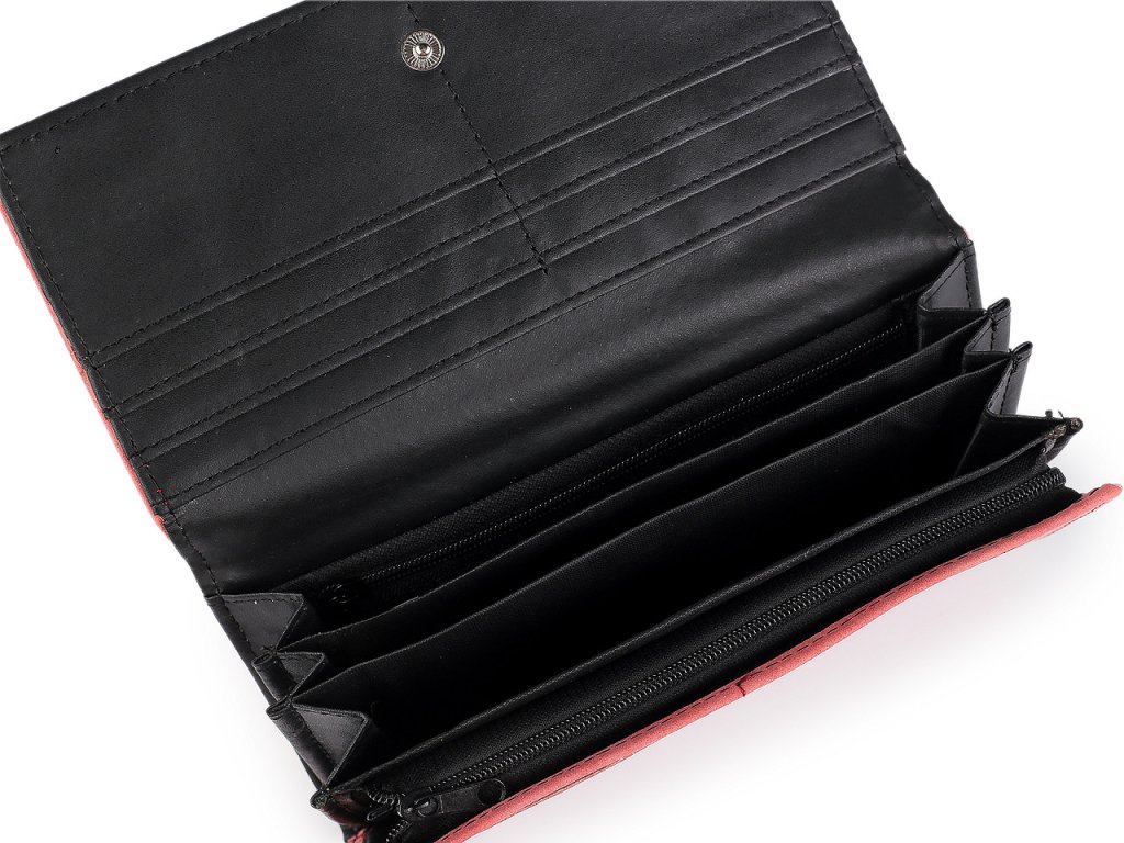 Peněženka má přední stranu na klopu se zapínáním na patent. Po otevření se objeví 8 přihrádek na kreditní karty, 2 jsou průhledné. Za přihrádkami po pravé straně je dlouhá přihrádka. Po rozevření naleznete 3 velké kapsy rozdělené separací a 1 kapsu na zip. Další kapsa na zip sloužící jako mincovník.