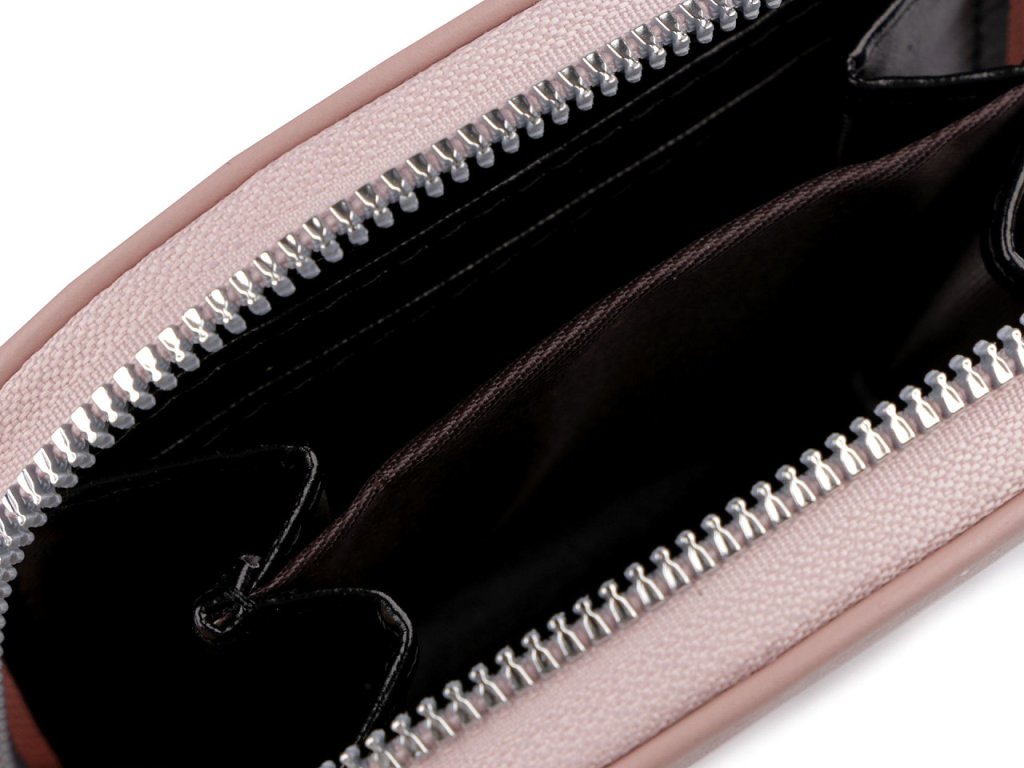 Zavírá se na zip. Uvnitř najdete hlavní prostor oddělený přepážkou na dva menší. V přepážce je mincovník na zip. Po stranách jsou ještě 4 přihrádky na karty.