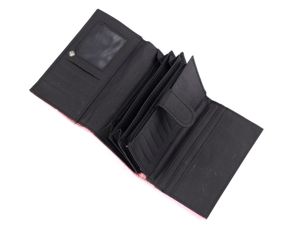Zavírá se na klopu a patent. Uvnitř jsou 2 oddělené prostory. Po pravé straně jsou 4 přihrádky na karty, z toho je 1 průhledná. Pod nimi je 1 velká plochá kapsa. Uprostřed peněženky se nachází 2 kapsy na bankovky, v jedné je malá kapsička na zip. Vlevo je mincovník, který se zapíná na zip. Peněženka ukrývá ještě druhý oddíl, který se objeví po odepnutí zápinky na levé straně. Zde se nachází 6 přihrádek na kreditní karty a 5 plochých kapes.