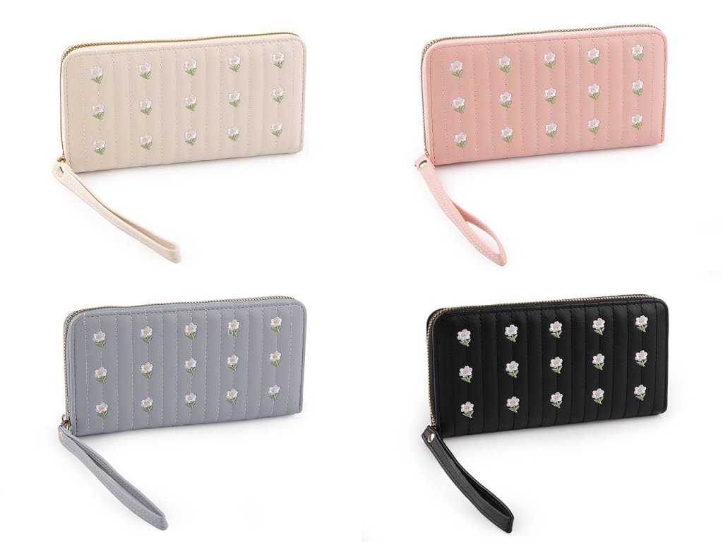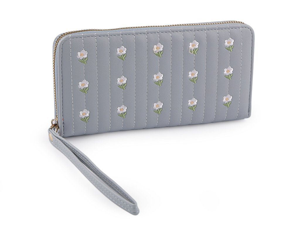 Dámská peněženka s výšivkou malých květů zaujme na první pohled. Květy má na přední straně, prošívané pruhy jsou i na zadní straně peněženky. Je vybavená dlouhým poutkem k nošení na zápěstí.