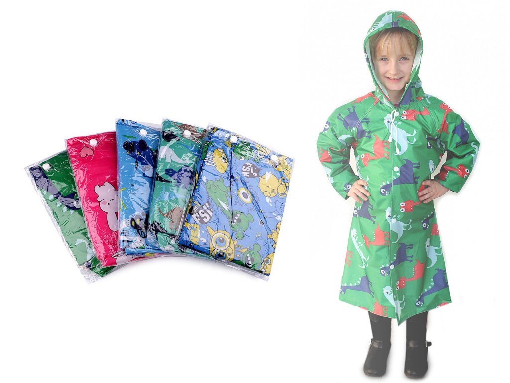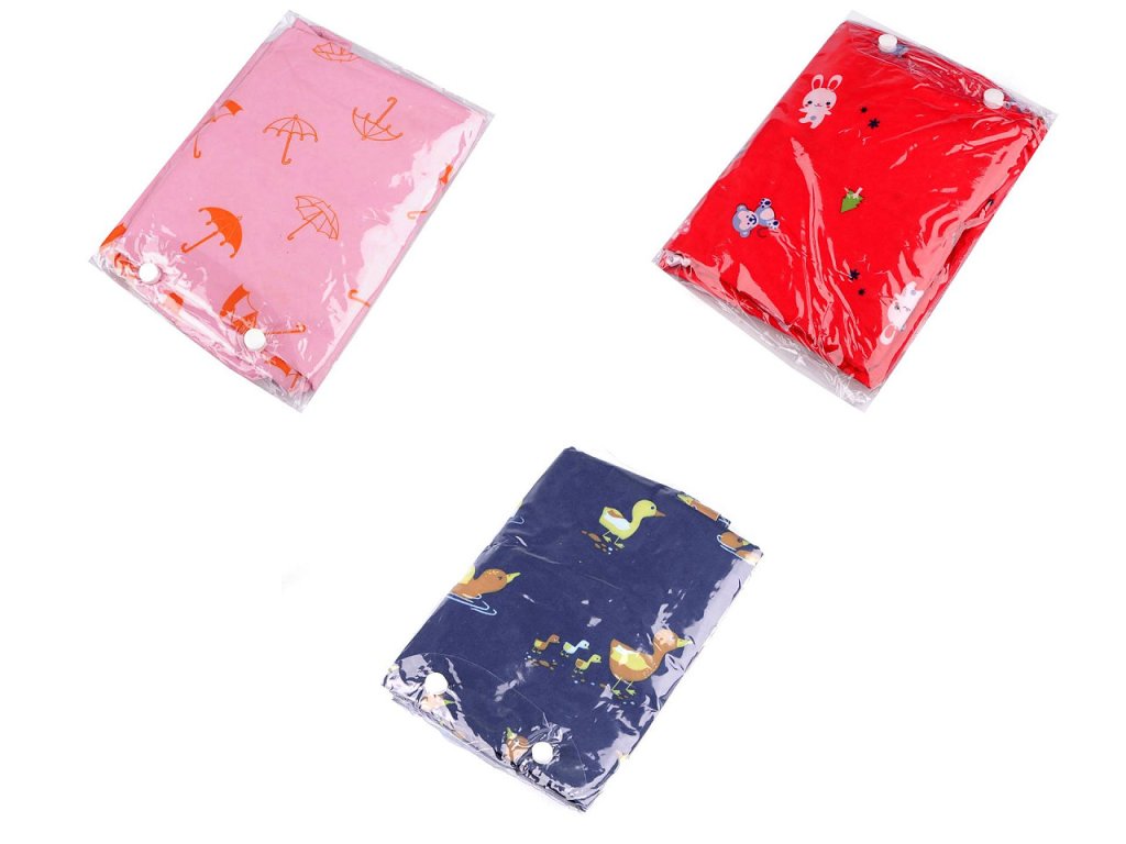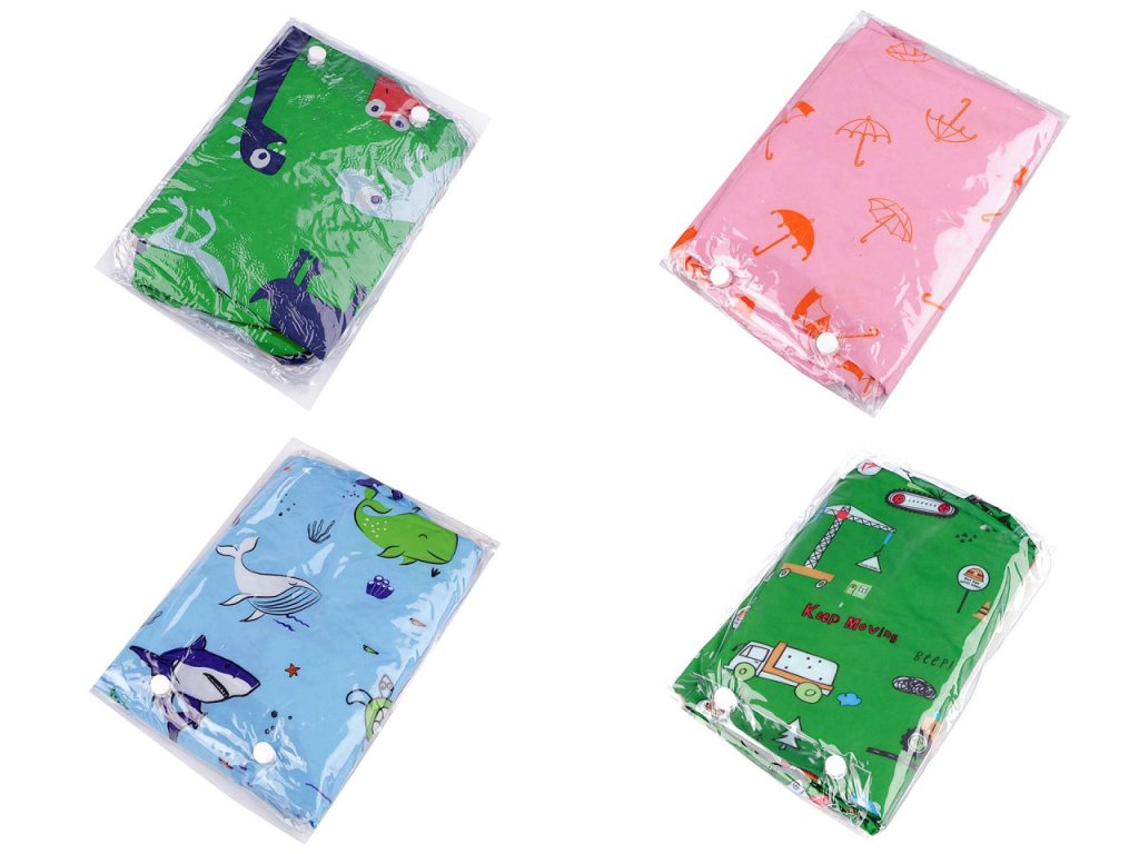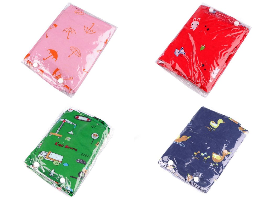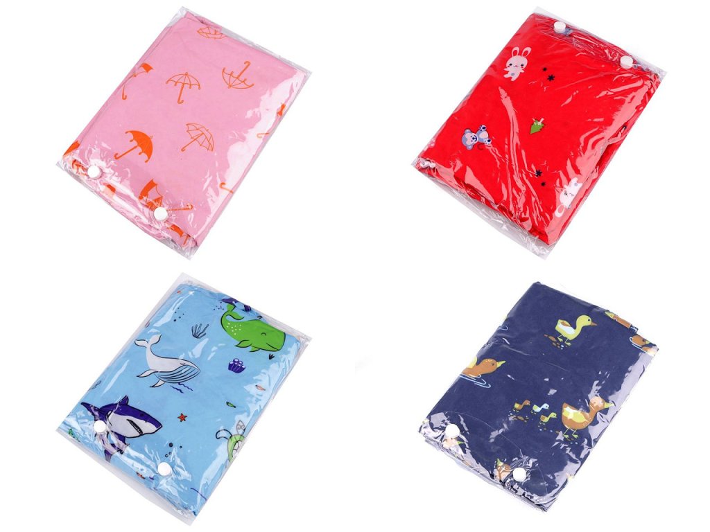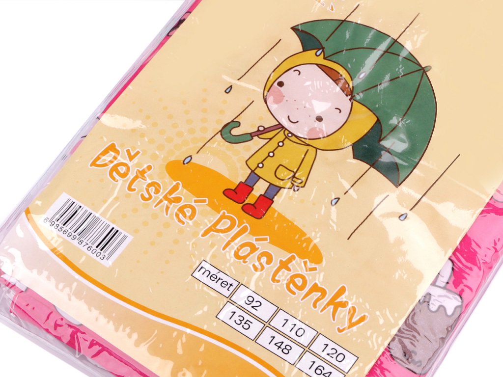 Kvalitní dětskou pláštěnku s veselými barevnými obrázky si děti oblíbí na první pohled. Je vyrobená z velice pevného materiálu. Zapíná se na druky. Kapuce má stahovací šňůrku. Pláštěnka je zabalená v ochranném pouzdru.