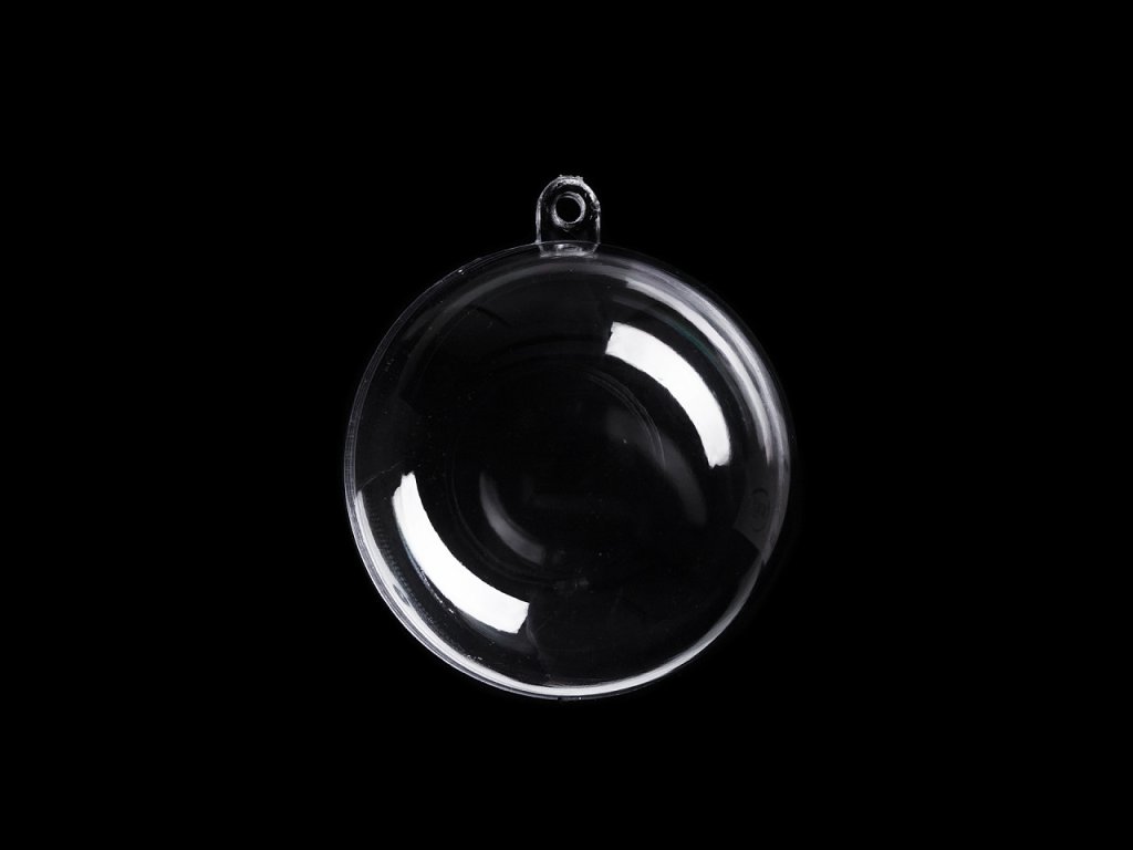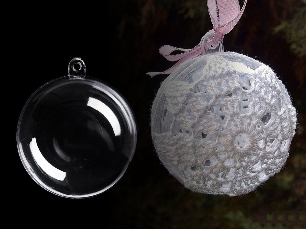 Průhledná plastová koule se skládá ze dvou dílů, které spojíte a díky očku pověsíte jako dekoraci. Je určena k dalšímu dozdobení např. ji můžete obháčkovat, dekorovat metodou quilling, ubrouskovou technikou, dozdobit glitry atd. Využijete ji také jako baňku na vánoční stromek.