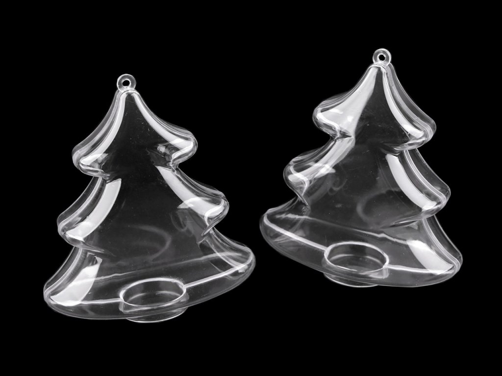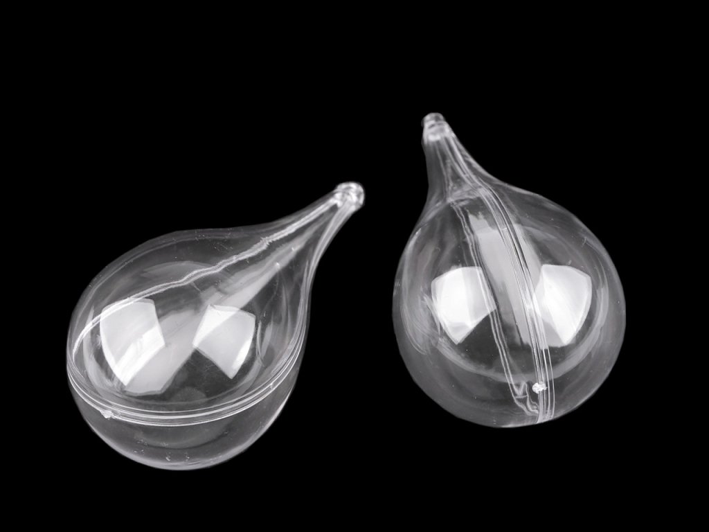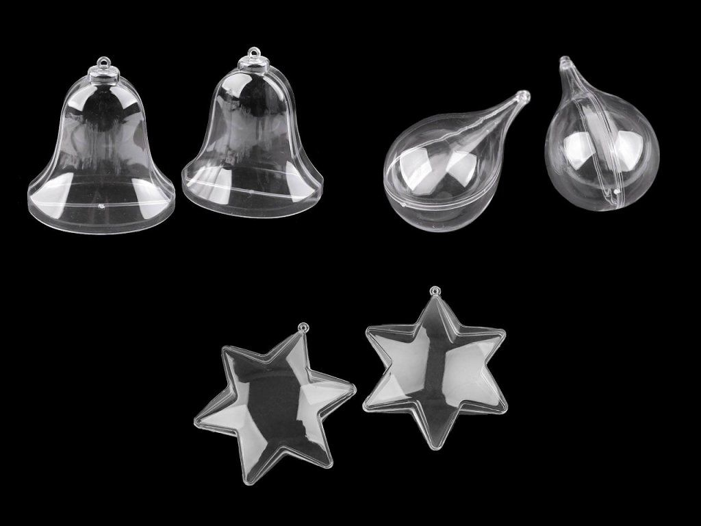Průhledné plastové objekty se skládají ze dvou dílů, které lze spojit a pomocí očka zavěsit jako dekoraci. Jedná se o polotovar, který je určený k dozdobení např. jej můžete obháčkovat, dekorovat metodou quilling, ubrouskovou technikou, dozdobit glitry atd. Dají se použít i jako dárková krabička.