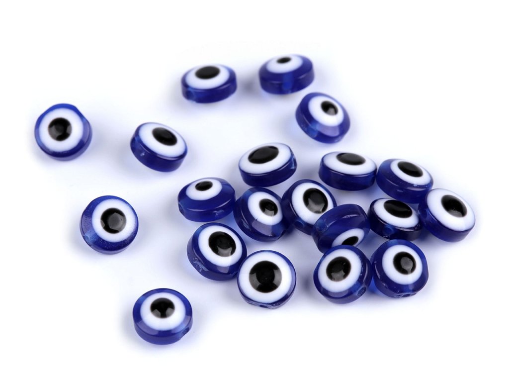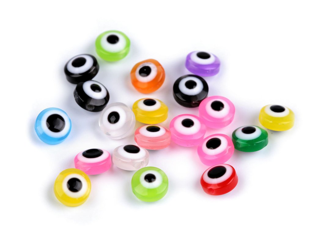 Plastové korálky Alláhovo oko mají výraznou, jedinečnou kresbou. Jsou oboustranné, mají tvar kulaté placičky, horní i dolní strana je vypouklá. Osloví vás při výrobě přívěsků, náušnic nebo náramků. Hodí se i do náhrdelníků. Jejich velkou výhodou je lehký materiál, proto je využijete i na ozdobení různých dekorací, např. lapačů snů.