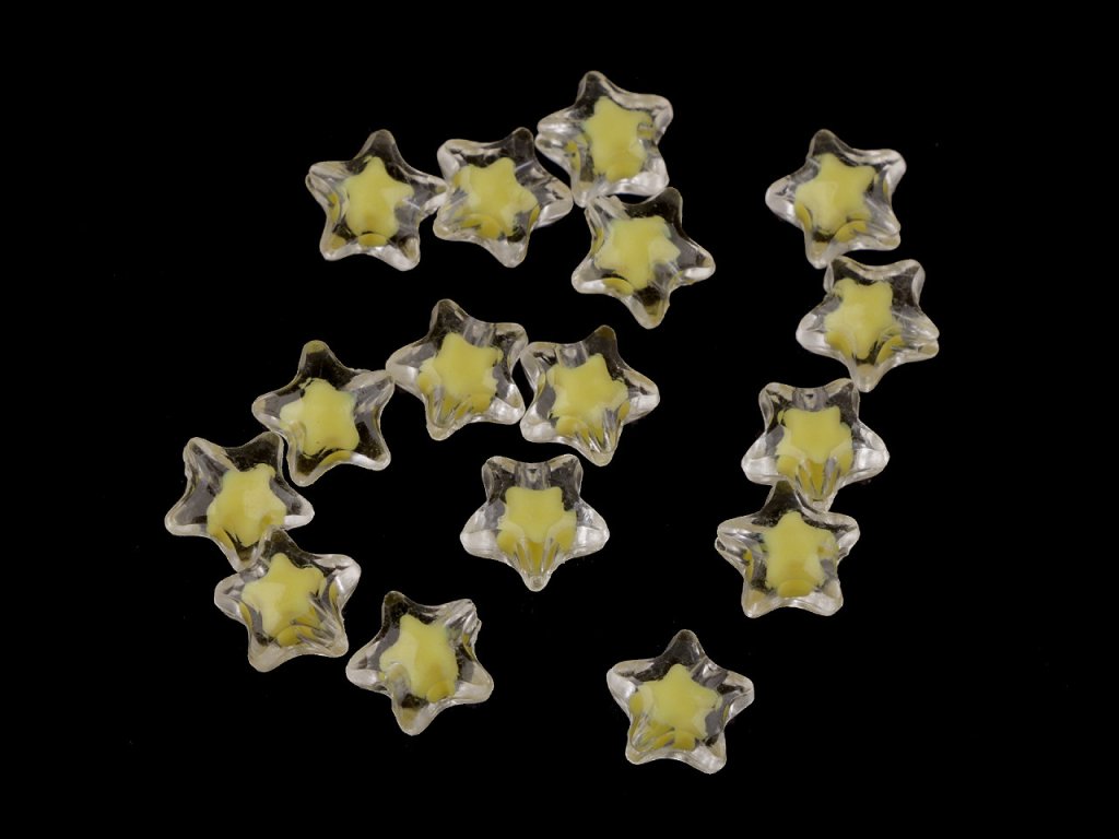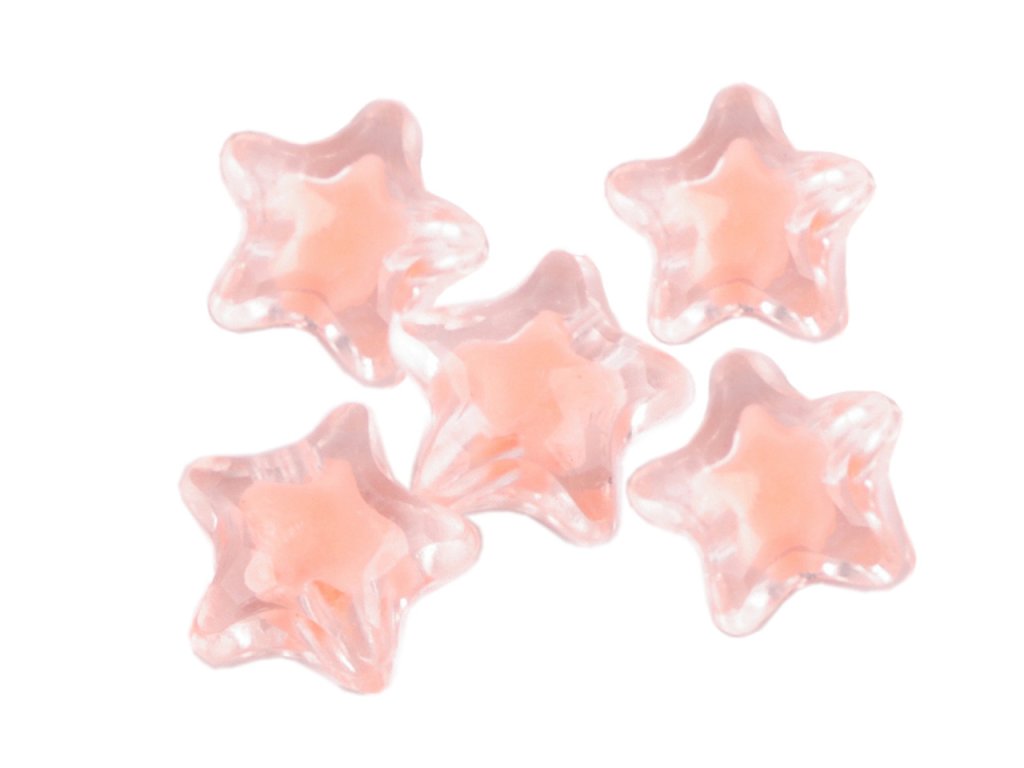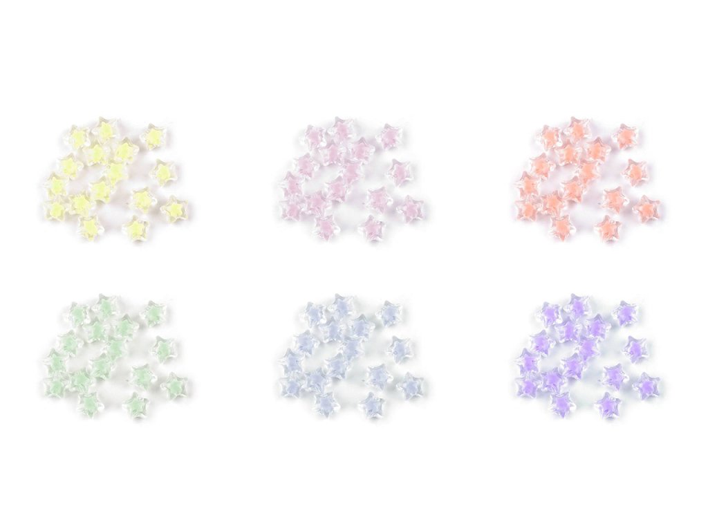 Plastové korálky ve tvaru hvězdy si oblíbí dospělí i děti. Jsou transparentní, s další barevnou hvězdičkou uvnitř. Využijete je na výrobu bižuterie, přívěskům ke klíčům apod. Můžete je navlékat například na pruženku či silon.