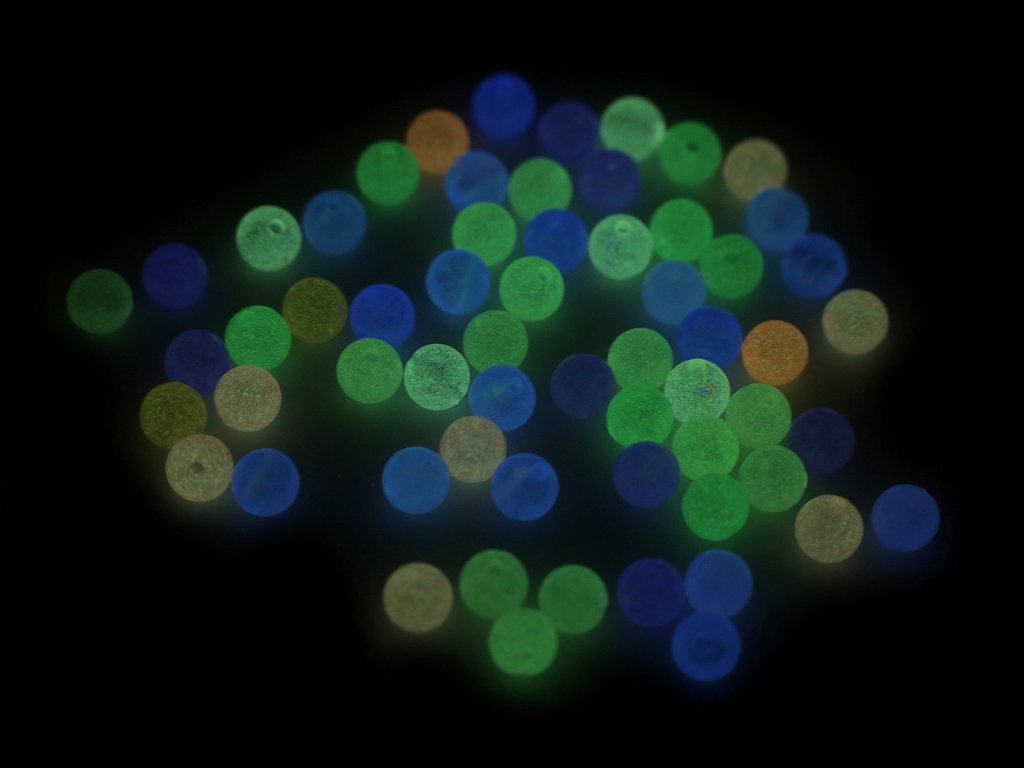 Barevný mix plastových korálků svítících ve tmě ocení všichni příznivci diskoték a nočních party. Stačí je přes den nechat ležet na světle nebo nosit na slunci, aby se světelně nabily a ve tmě budou samy zářit. Přes den oceníte jejich poutavou poloprůsvitnou barvu.