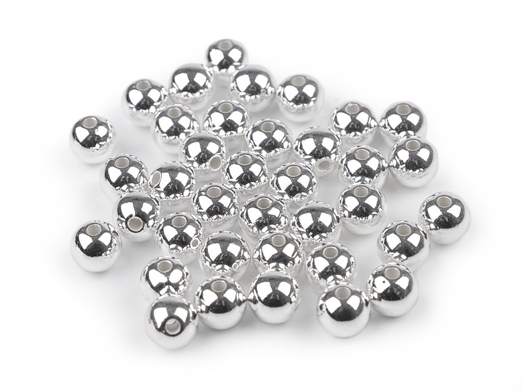 Plastové korálky s metalickou, vysoce lesklou úpravou na povrchu mají tvar kuličky.