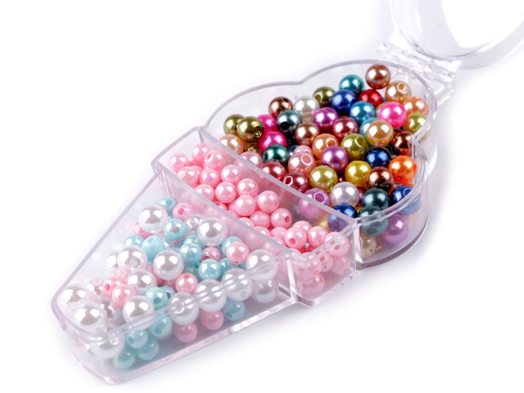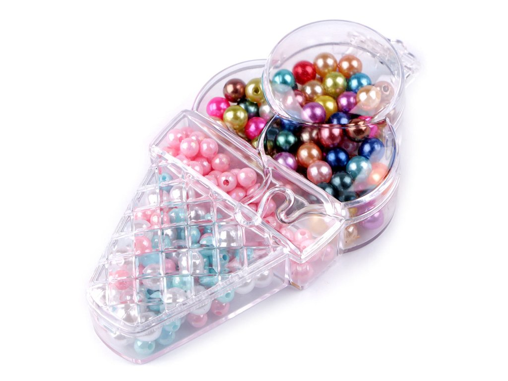 Plastový box ve tvaru zmrzliny obsahuje barevný mix plastových perel. Korálky mají blýskavý lesk jako pravé perly, sada bude bezvadným dárkem pro dívky, které si mohou navléknout náramky a náhrdelníky. Velikost korálků je 6 a 8 mm. Box má očko k zavěšení.