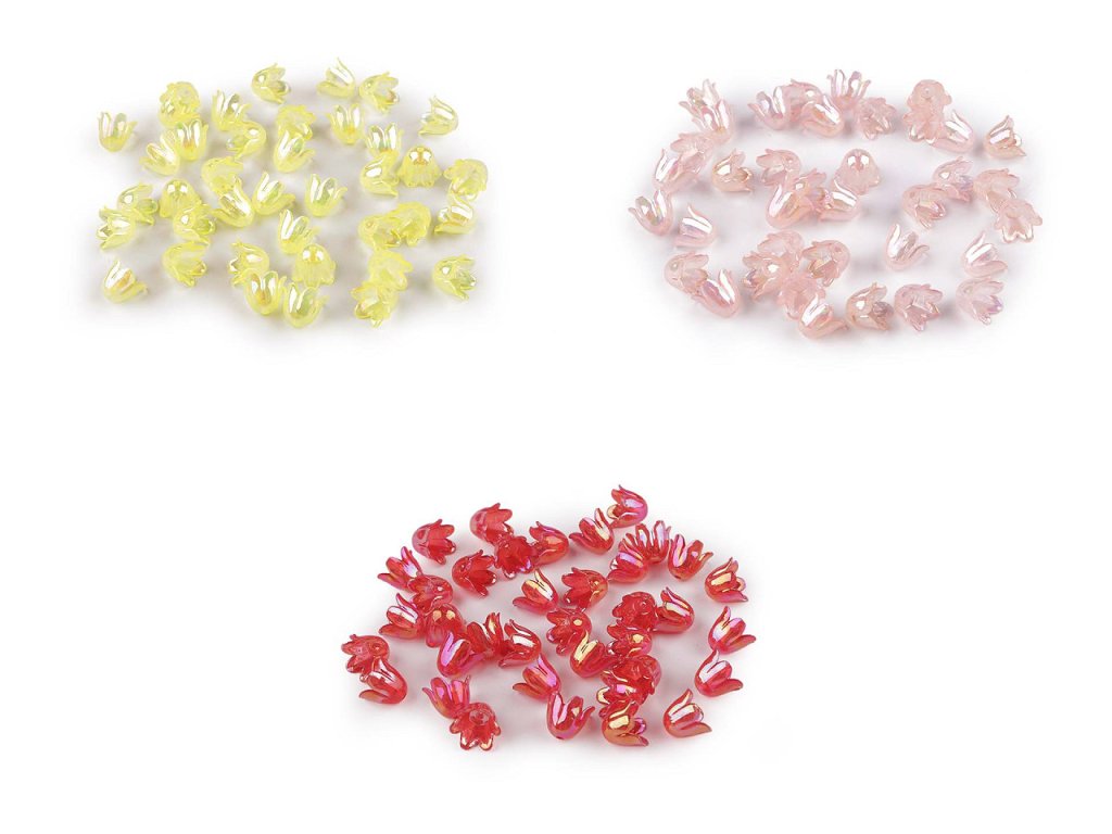 Plastové korálky květů ve tvaru zvonku nadchnou děti i dospělé. Jsou doslova magické, protože na povrchu mají nádherný lesk s AB efektem. Ocení je korálkářky, které rády tvoří květinové šperky nebo malé andělíčky. Korálky můžete použít na výrobu náhrdelníků, přívěsků ke klíčům, jako sukýnku na korálkové andělíčky, hodí se i k ozdobení tašek apod. Jejich velikou výhodou je nízká hmotnost.