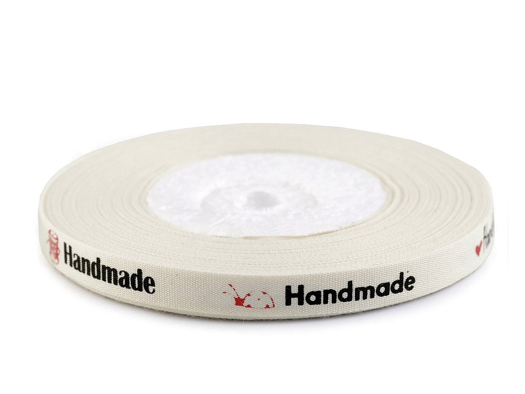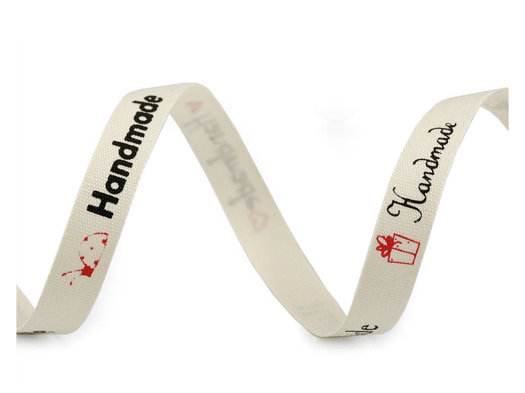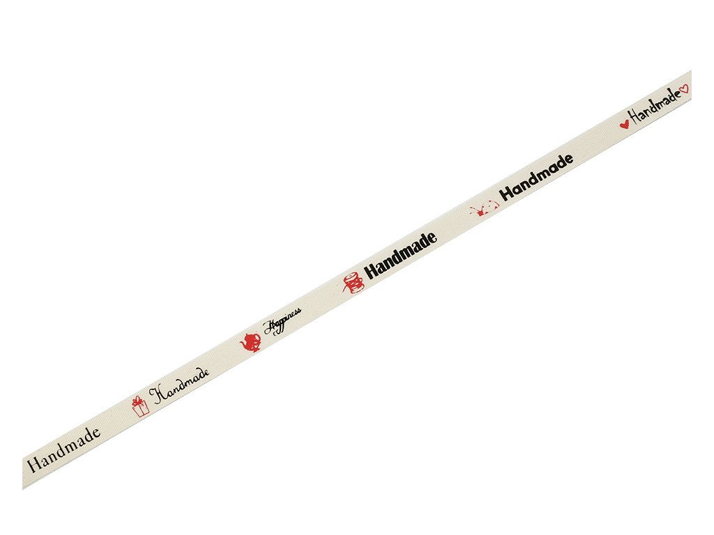 Bavlněnou stuhu zdobí nápis "hand made" v různých stylech písma. Nápisy jsou doplněny jednoduchými obrázky. Stuha je pevná a příjemná na dotek.
