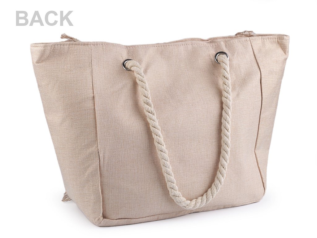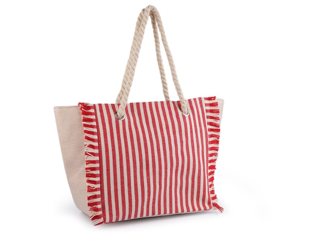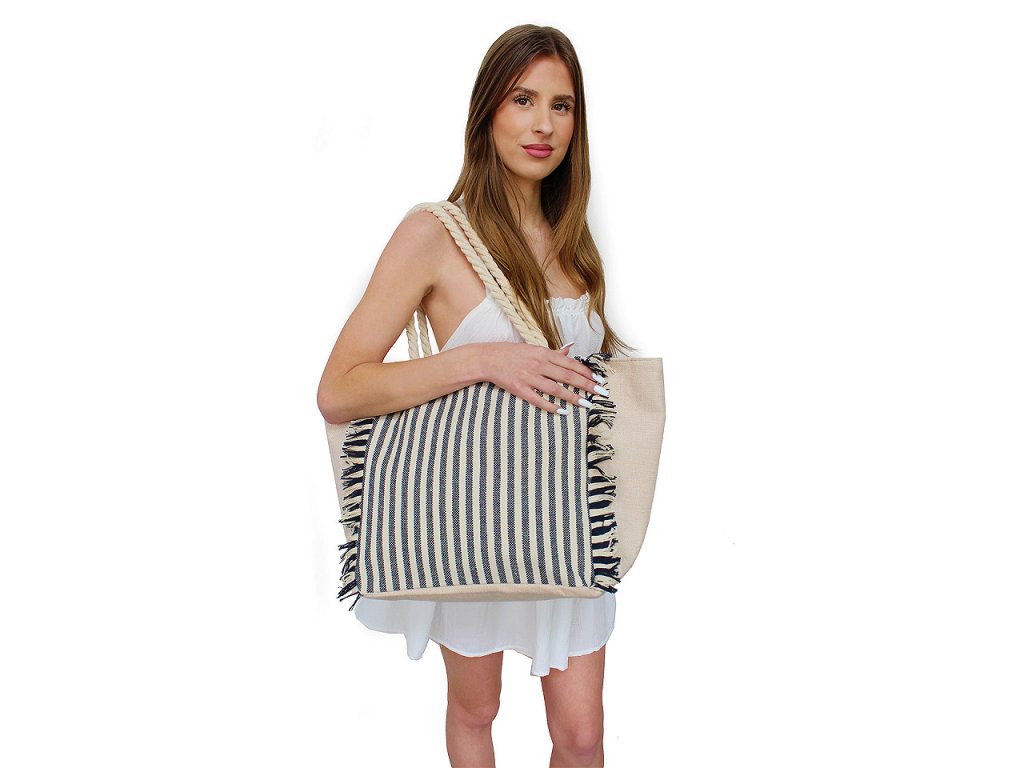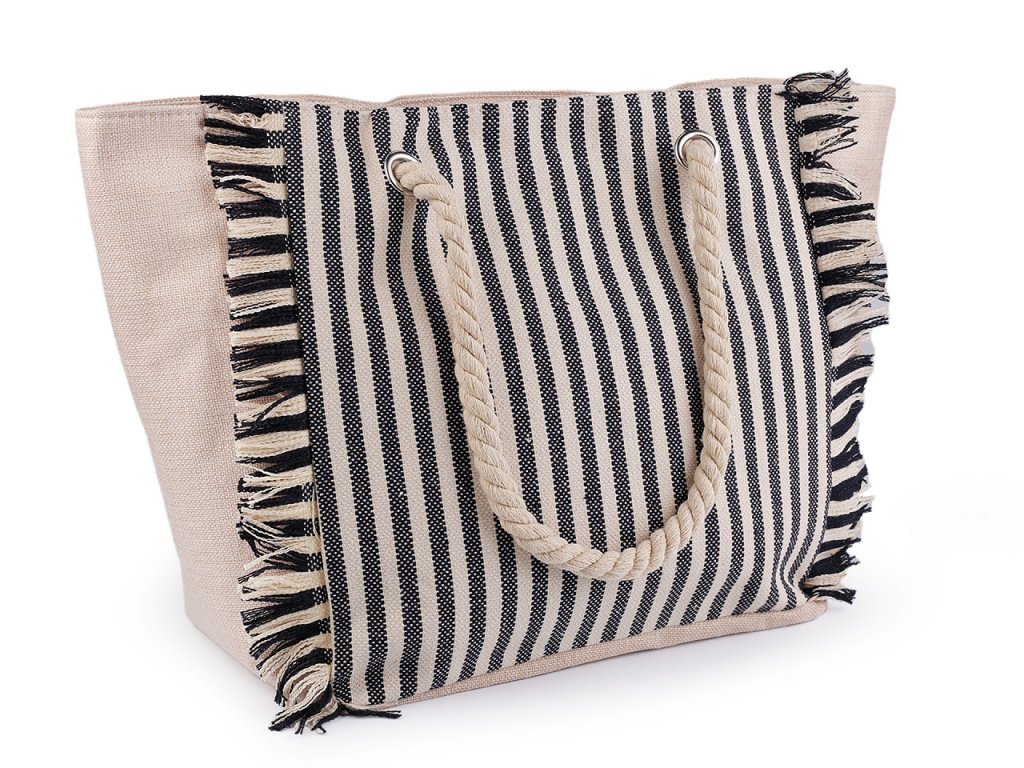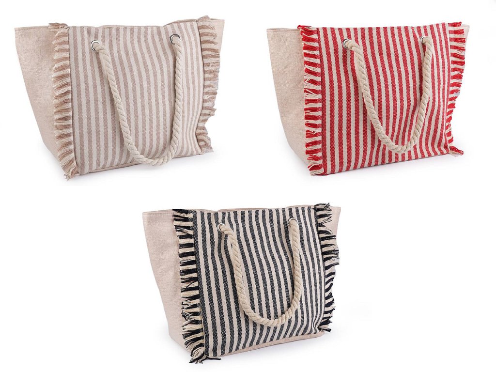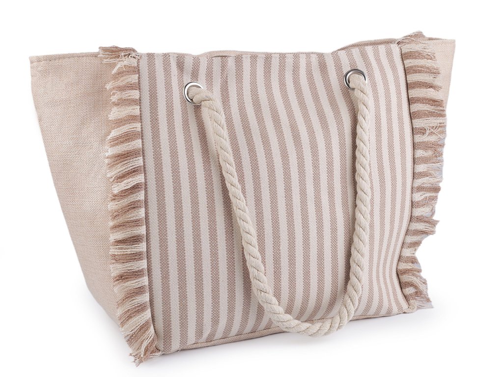 Pruhovanou tašku s třásněmi využijete na procházky městem, u vody i na dovolené. Díky rozšířenému dnu dobře stojí. Je pevná a prostorná, vejde se do ní vše, co potřebujete. Díky velkým uchům z kroucené šňůry ji můžete nést v ruce i na rameni. Uvnitř má taška polyesterovou podšívku s kapsou na drobnosti. Nahoře se taška uzavírá na zip.