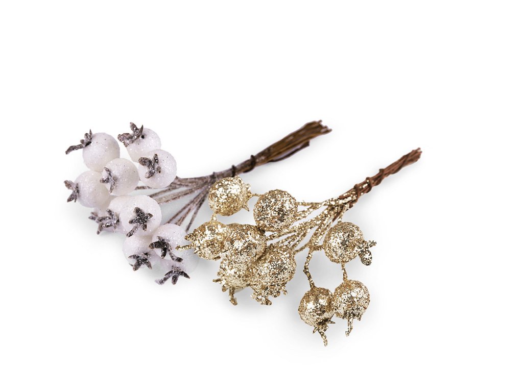 Dekorační bobule jsou připevněné drátku a celé se díky glitrům třpytí. Můžete je zakomponovat do věnců, polystyrenových polotovarů, ikeban, květinových vazeb apod.