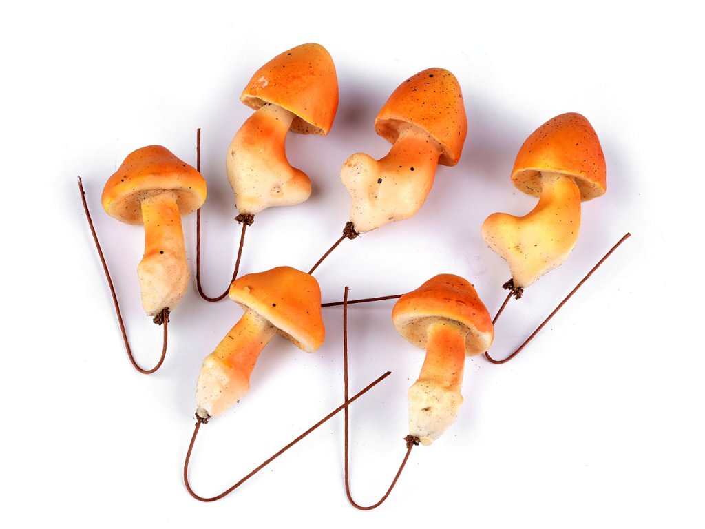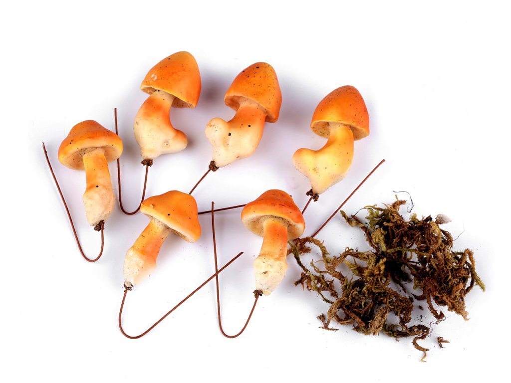 Umělé houby jsou připevněná na drátku, který se dá dobře tvarovat. Vypadají jako živé, jsou z pevnějšího materiálu. Lehce se zapichují do polystyrenových polotovarů, věnců, květinových vazeb apod. Můžete k nim naaranžovat i přírodní mech, který je součástí balení.