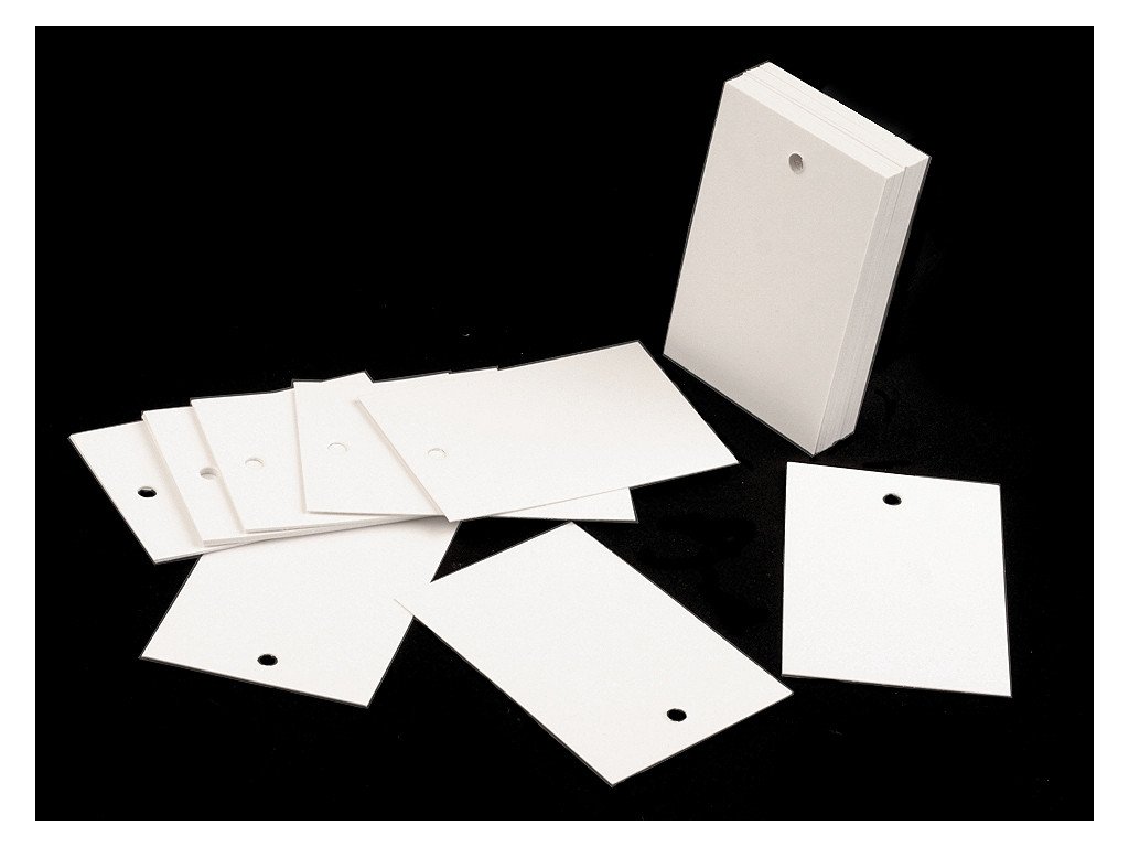 Je vyrobená z pevného papíru, horní strana je křídová, pololesklá. V horní části má vyražený kruhový otvor.