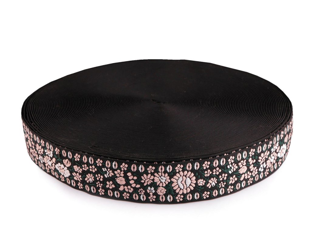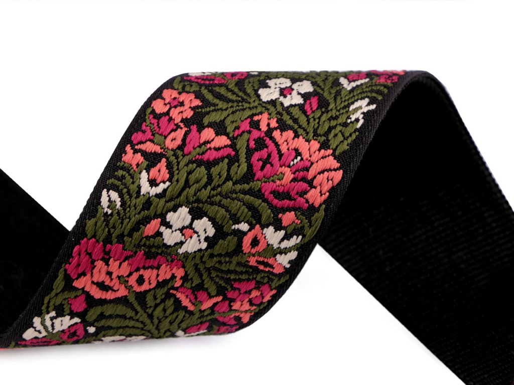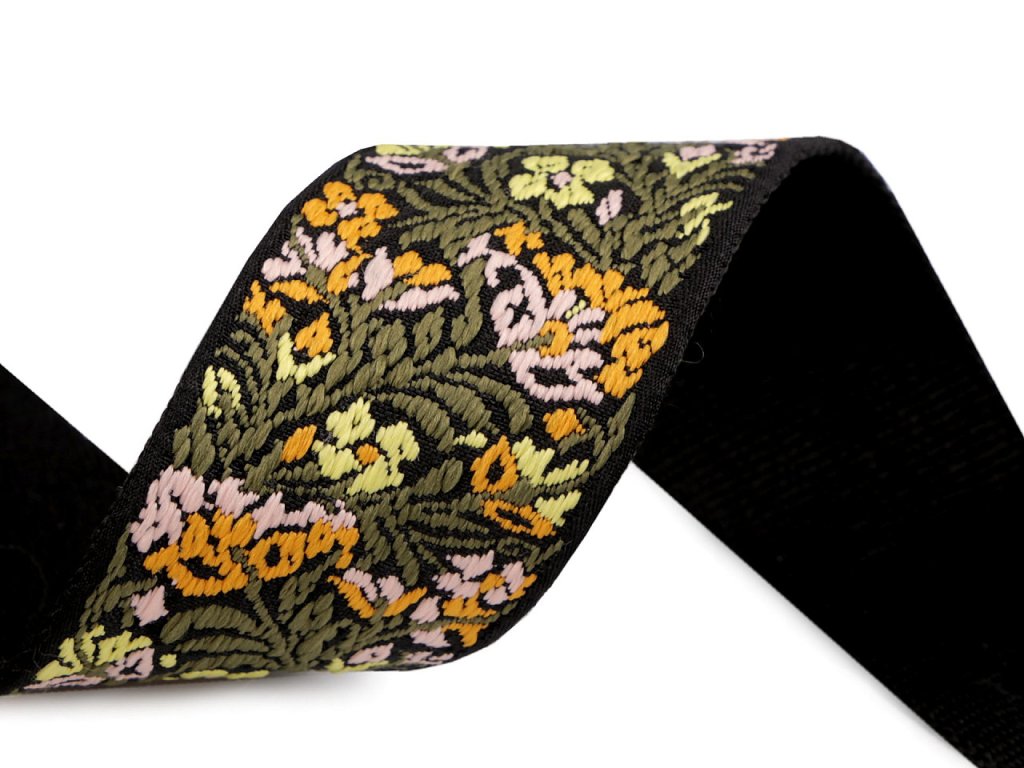 Textilní popruh zdobí efektní a propracovaná výšivka. Vynikne jako ucho na kabelkách, taškách a batozích.