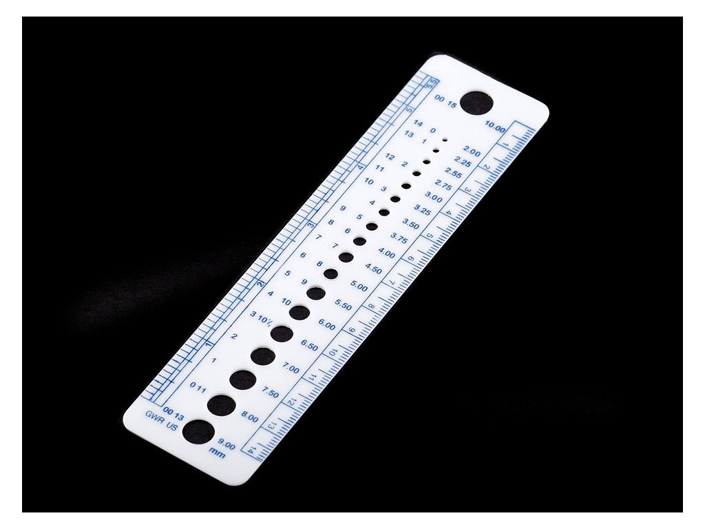 Pravítko na jehlice má otvory s uvedenou velikostí v mm, GWR a US. Budete tak mít přehled nejen v českých značeních, ale i v zahraničních. Po stranách jsou klasická pravítka. Jedno v milimetrech, druhé v palcích.
