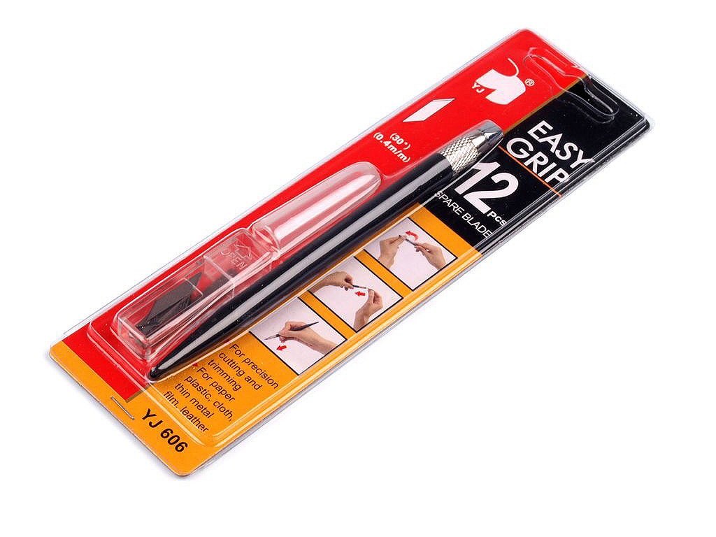 Sada obsahuje: 12 vyměnitelných čepelí 4 x 22 mm, s délkou ostří 7 mm, plastový tužkový držák o průměru 0,9 cm, dlouhý 14 cm a kovové šroubovací pouzdro na uchycení čepele.