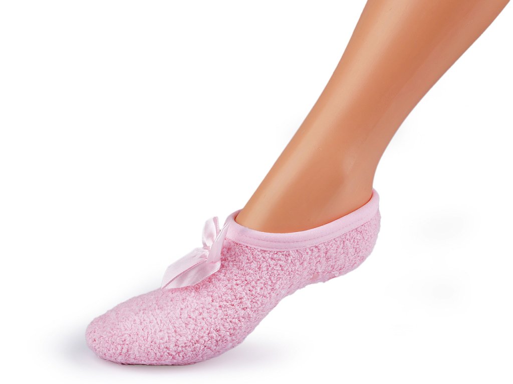 Romantické froté ponožky si oblíbíte na spaní a domácí lenošení, protože jsou neuvěřitelně měkké a hebké. Jsou ozdobené saténovou mašlí, mají plochý šev ve špičce - netlačí. Díky pružnému a přizpůsobivému okraji dobře sedí na noze. Na spodní straně mají protiskluzové puntíky.