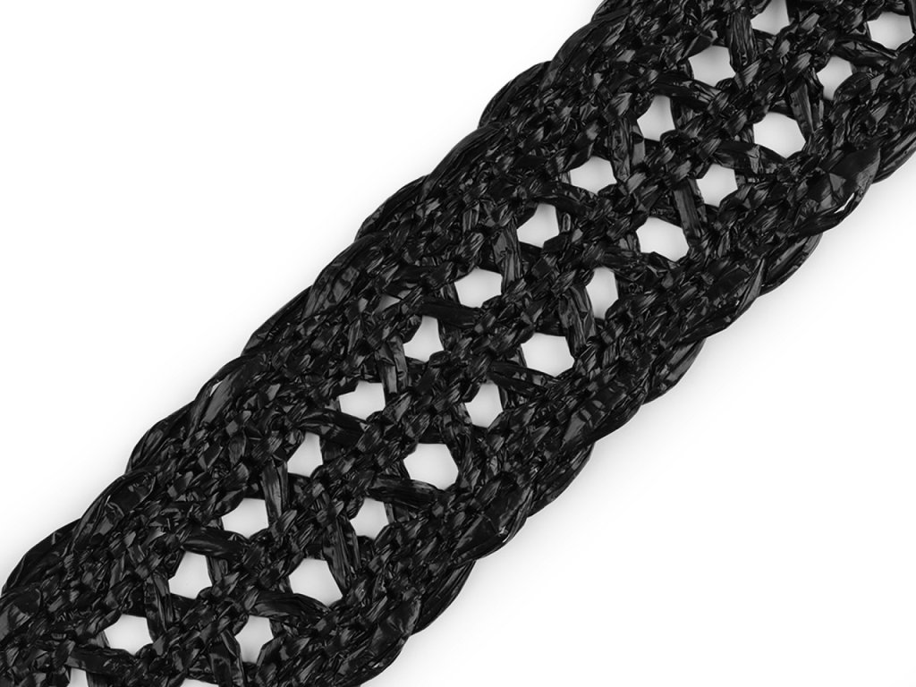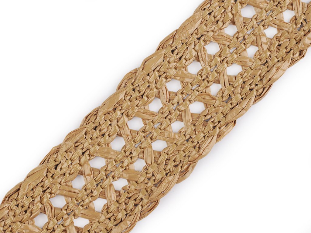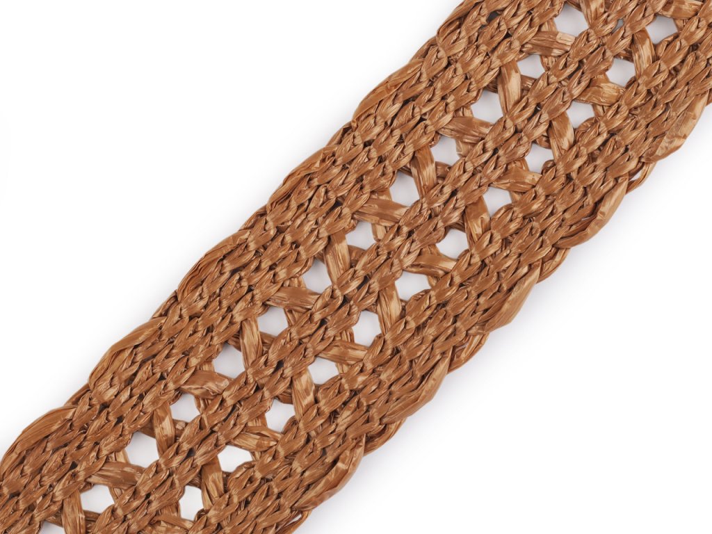 Splétaný popruh imituje slámu. Stylově ozdobí letní tašky, kabelky nebo klobouky. Zajímavě vynikne také jako pásek. Materiál, ze kterého je vyrobený, je pevný a odolný.