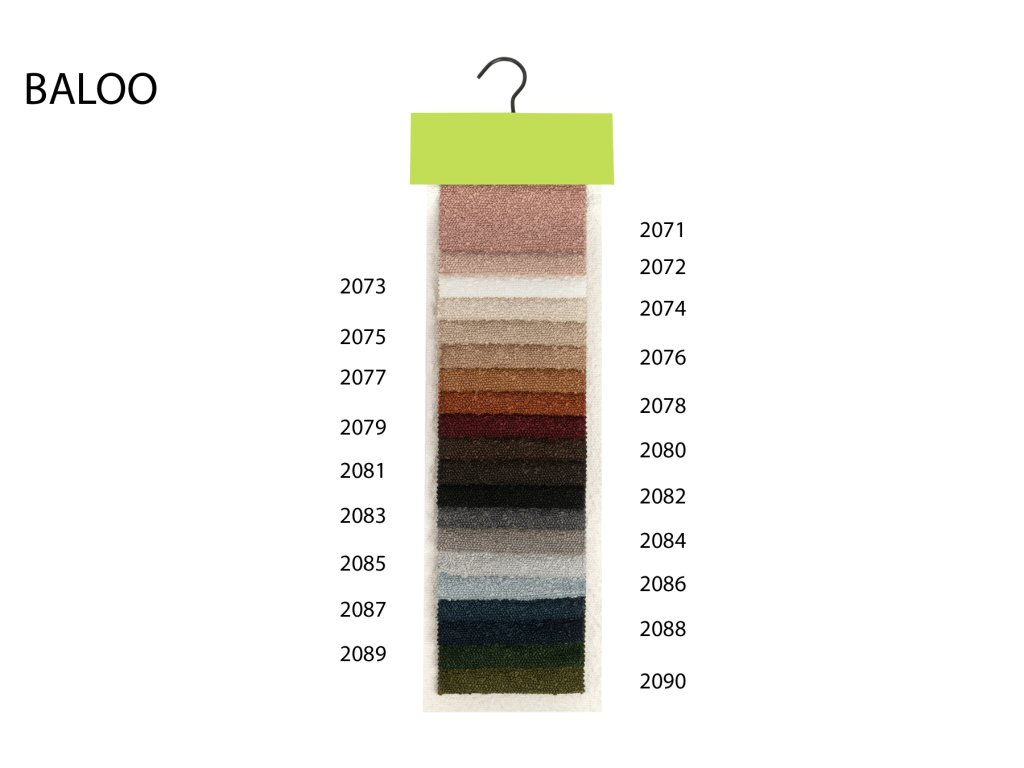 Vysoce odolná a kvalitní látka typu buklé BALOO je vhodná na čalounění nábytku, dekorační polštáře, čela postelí, závěsy nebo přehozy. Má cigaretový test podle normy EN 1021-1 a certifikát OEKO TEX STANDARD 100.
