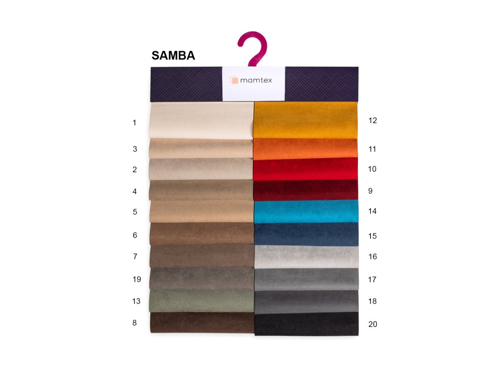 Potahová látka SAMBA je na povrchu obdobná semišové kůži, prodyšná, ohebná, nemačkavá. Disponuje také nehořlavou úpravou dle cigaretového testu EN 1021-1.