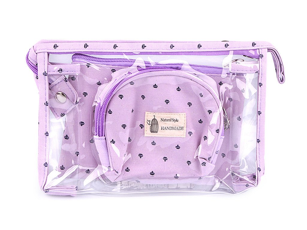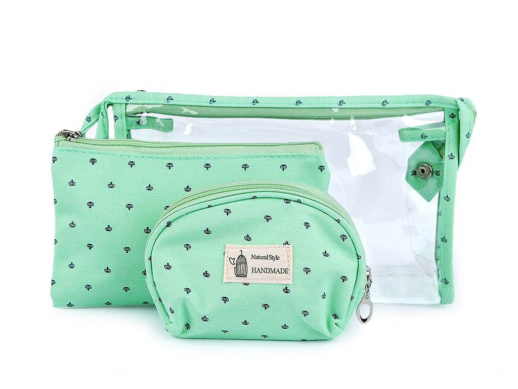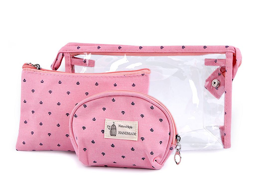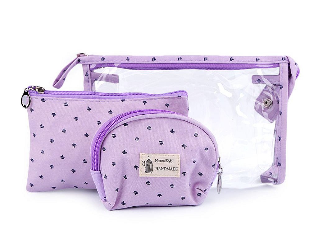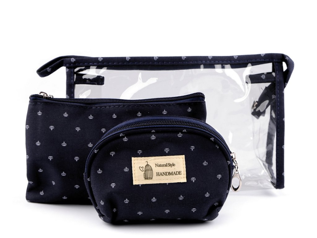Sada se skládá ze 3 tašek různých velikostí s designem s drobnými korunami. Zapínání je na zip. Velká taštička - 15 x 25 x 7 cm - je průhledná, má praktické poutko na pověšení, na druhé straně můžete konec zipu připnout na cvoček. Tašku si tak můžete připnout k poutku uvnitř zavazadla, což může zabránit její ztrátě. Prostřední textilní taštička - 13 x 19 x 1 cm - má uvnitř podšívku, malá textilní taštička - 11 x 14 x 3 cm - má také podšívku.