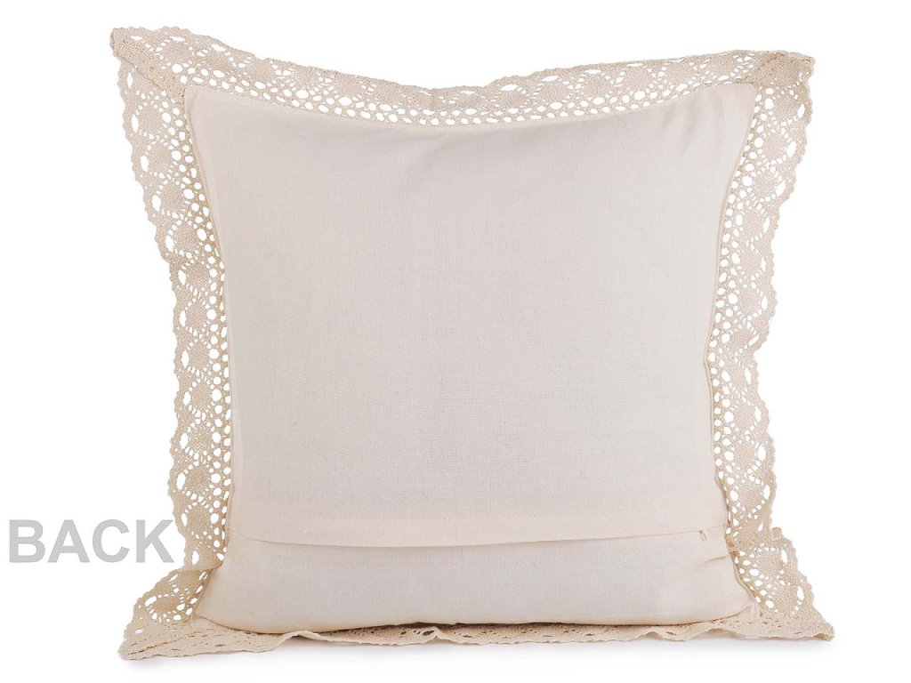 Povlaky na polštáře s paličkovanou krajkou dodají vintage nebo boho atmosféru každému interiéru. Na zadní straně se zapínají na zip. Přední strana polštáře je s krajkou, zadní je jednobarevná. Krajka přesahuje přes okraj textilního potahu.