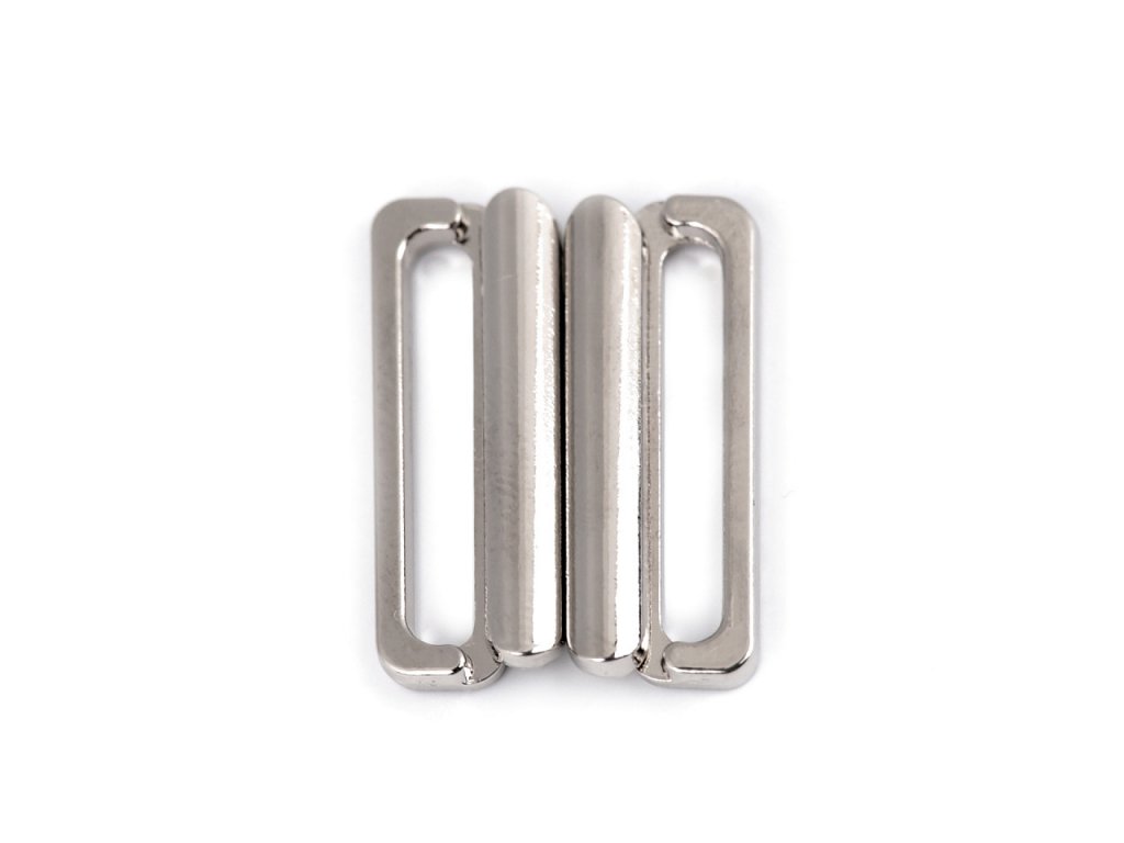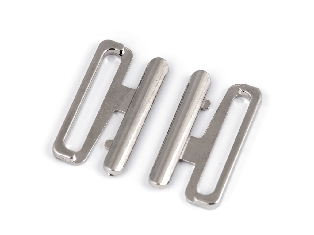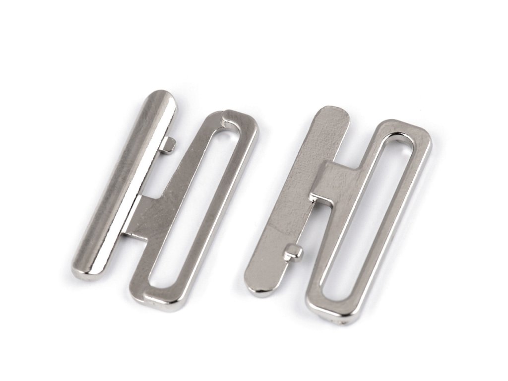 Kovové zapínání na plavky se skládá ze dvou dílů a zapíná se vsunutím jednoho dílu mezi druhý díl. Rozměry jednoho dílu spony jsou 13 x 24 mm.