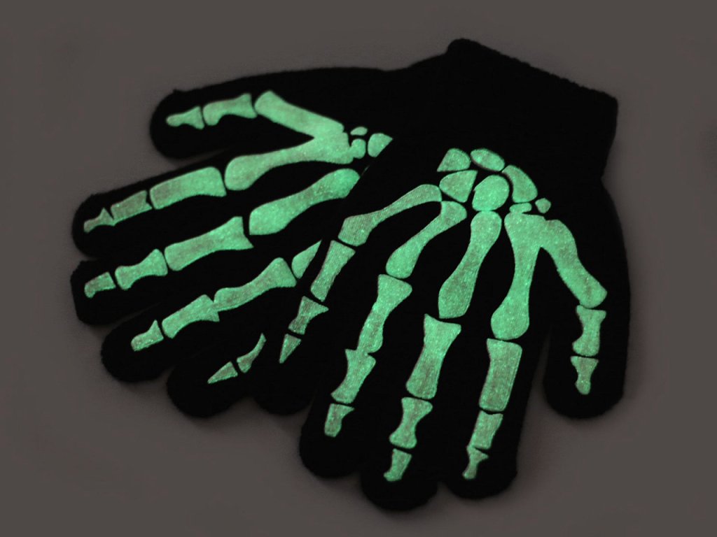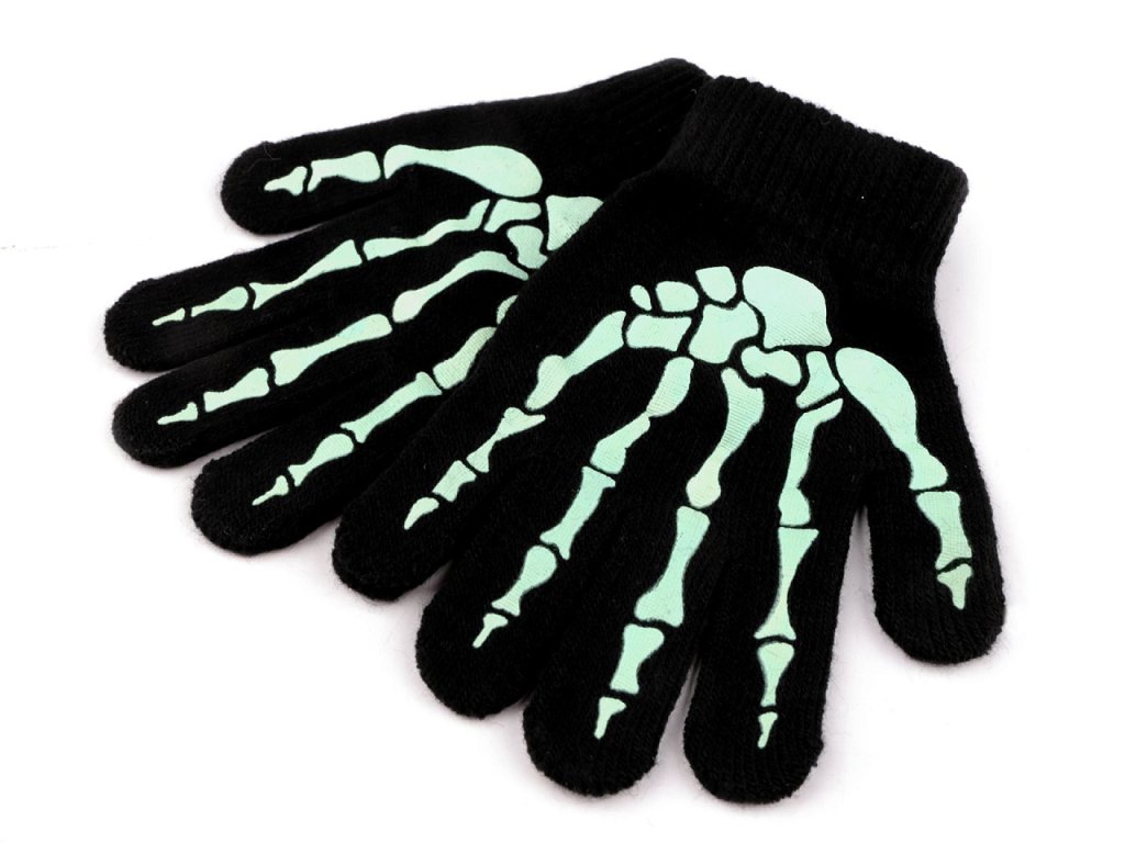 Pletené prstové rukavice si děti zamilují kvůli gumovému potisku ruky kostlivce svítícího ve tmě. Jsou ideální do sychravého podzimního a zimního počasí. Budou skvělým doplňkem na halloween i ke karnevalovým kostýmům. Jsou pružné, z jemné pleteniny. Ruce se skvěle přizpůsobí, výborně se natahují. Díky pružnému lemu kolem zápěstí pevně drží - nesklouzávají.