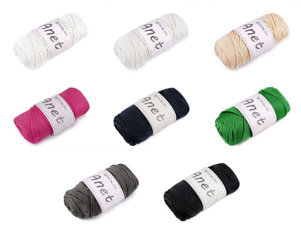 Pletací příze Anet připomíná provázek a má jemně lesklý povrch. Hodí se na pletení a háčkování tašek, košíků a podobných výrobků i na techniku macrame.