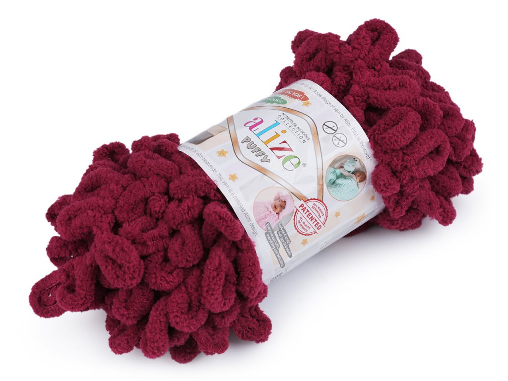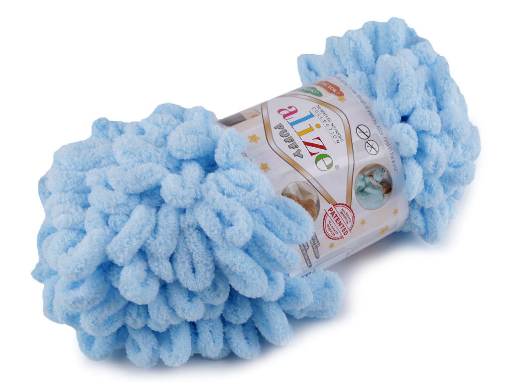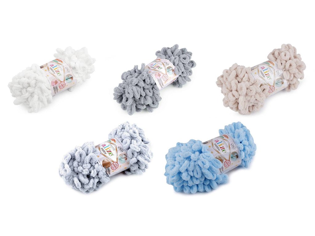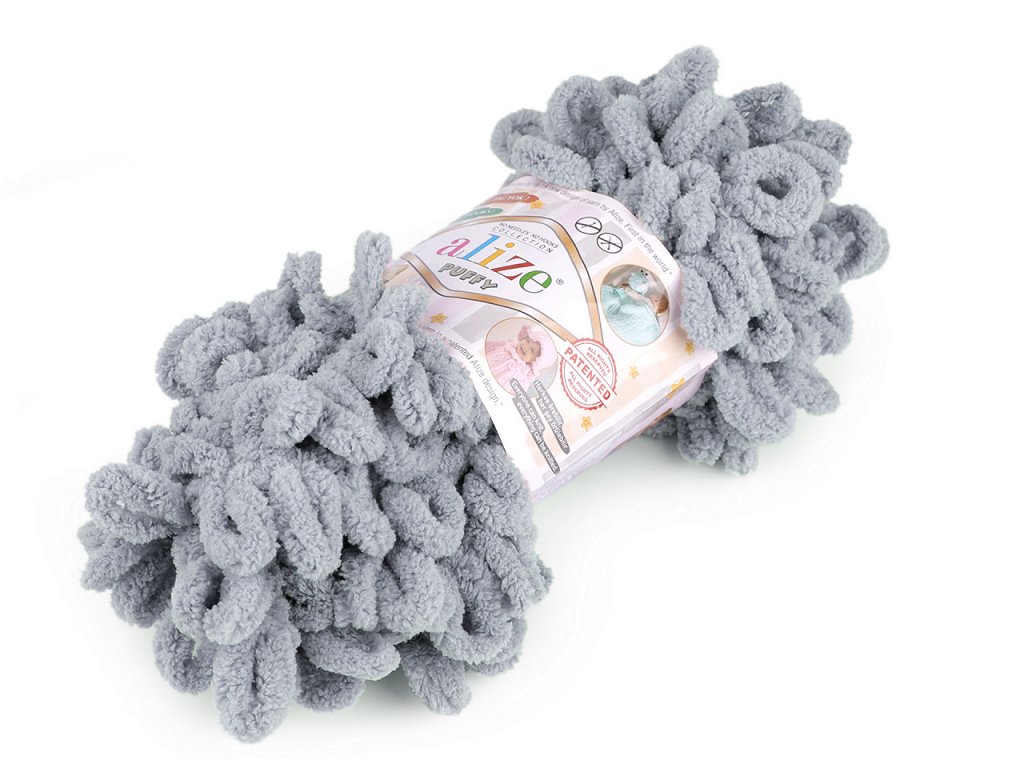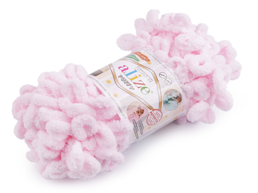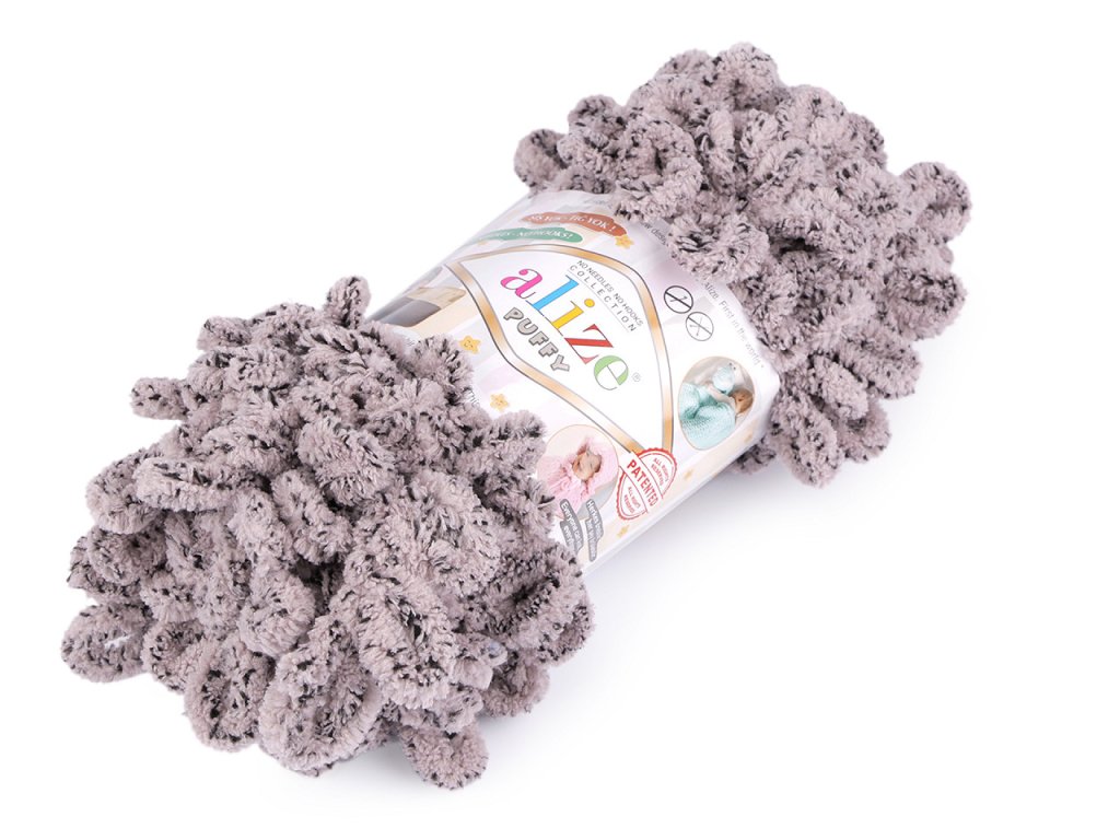 Příze Alize Puffy je měkká, chlupatá žinylková příze s velkými očky. Na pletení nepotřebujete jehlice ani háček - proplétají se jednotlivá očka. Je vhodná na pletení dek, šálů apod.