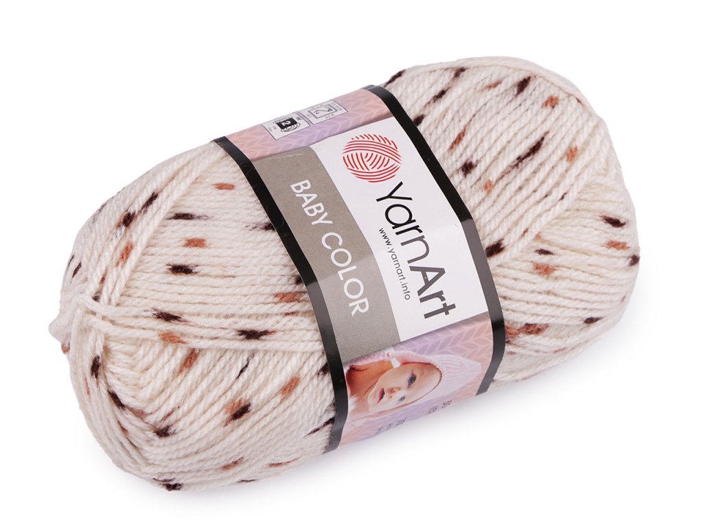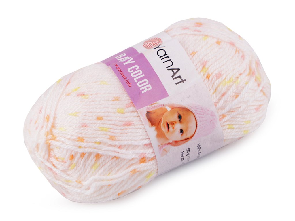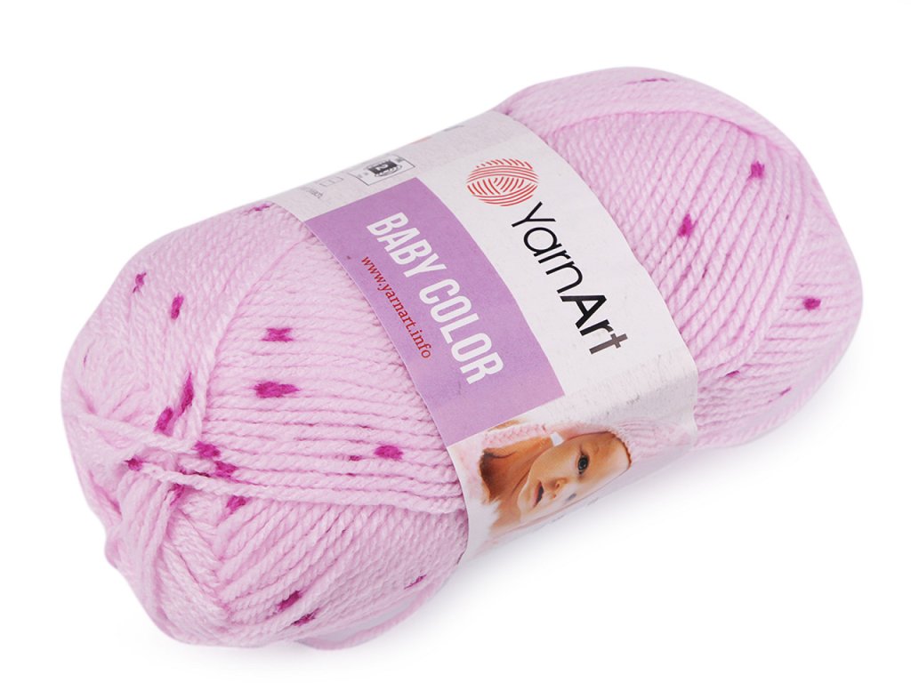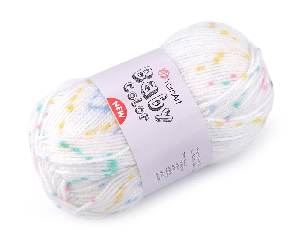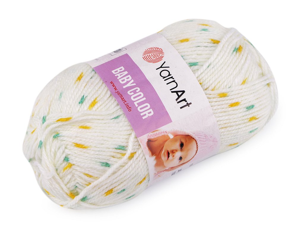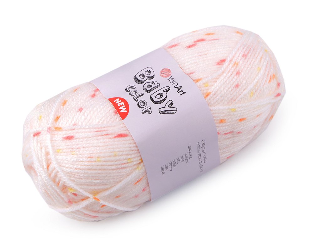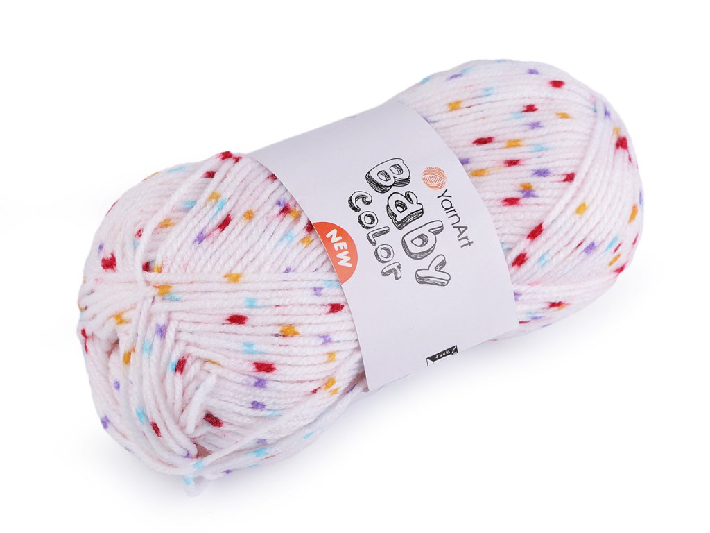 Pletací příze Baby Color se zajímavým barevným efektem je měkká, lehoučká a příjemná na dotek. Má antipillingovou úpravu, která zabraňuje žmolkování. Je také hypoalergenní, což oceníte při výrobě čepiček, svetříků, šatiček, dek a dalších věcí pro nejmenší děti a pro miminka.