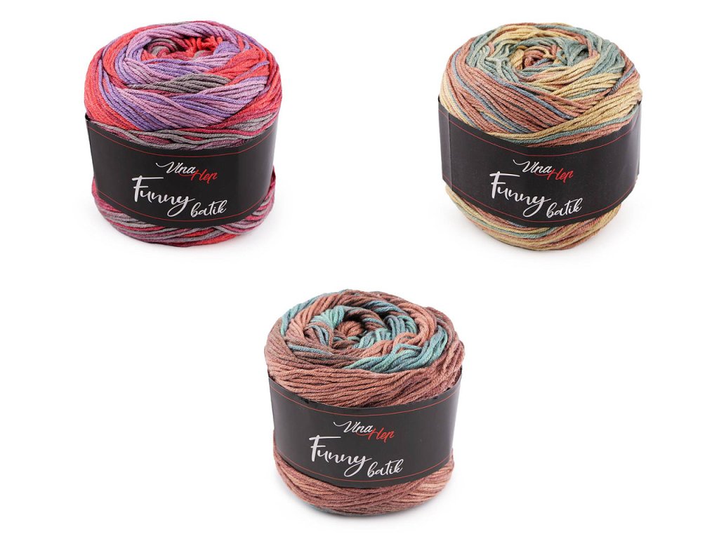 Pletací příze Funny Batik dodá vašim výrobkům poutavý a originální vzhled díky svému melírovanému zabarvení. Je měkká a příjemná na dotek. Můžete z ní uplést či uháčkovat svetry, šály, nákrčníky, čepice, vesty apod.