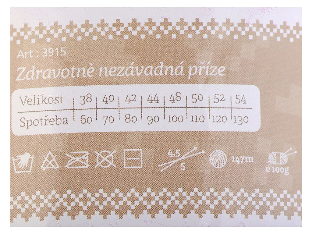 Vzorek na fotografii (51 x 23 cm) byl upleten z 1 klubíčka, jehlicemi č. 5.