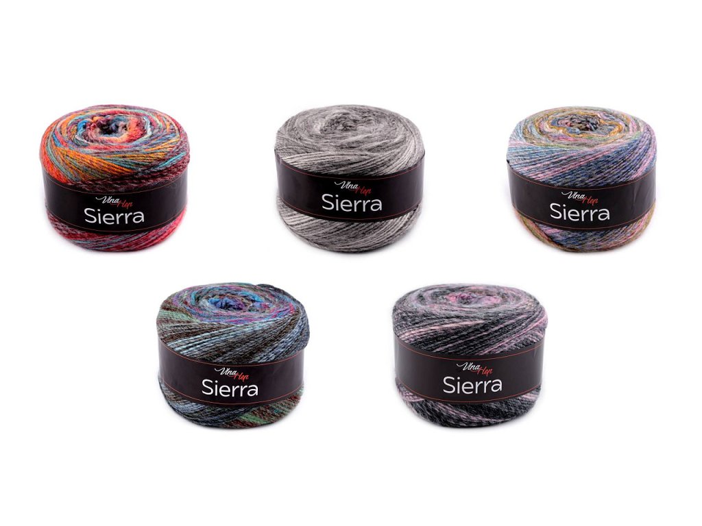 Příze Sierra dodá vašim výrobkům jedinečný vzhled díky svému barevnému efektu. Hřejivý materiál je vhodný do chladnějšího počasí. Z příze můžete uplést či uháčkovat svetry, šály, čepice, rukavice, plédy apod.