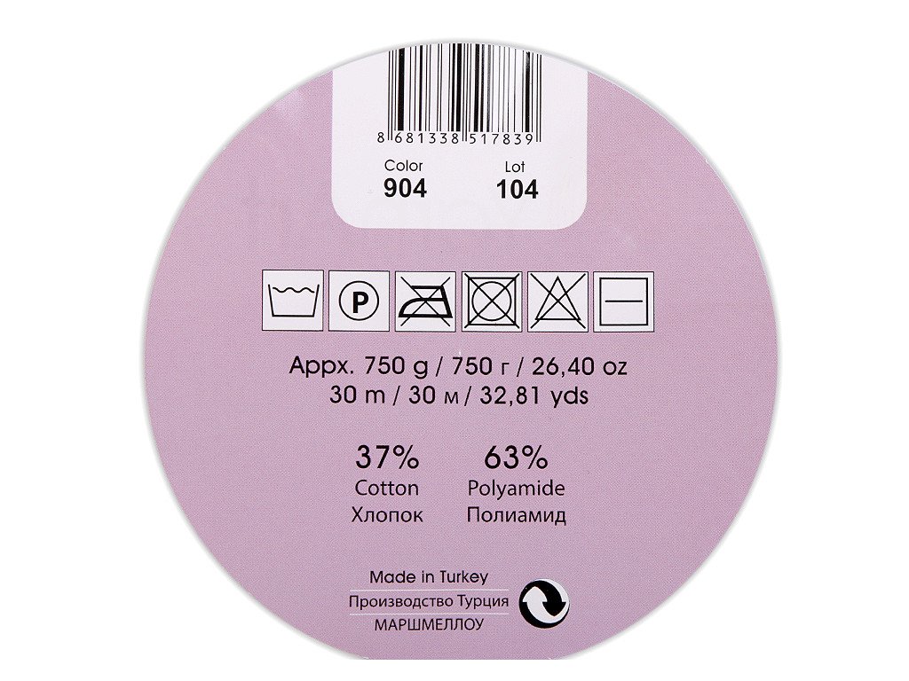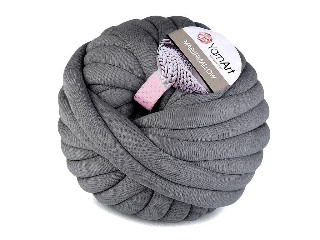 Silná příze Marshmallow je objemná, ale lehká. Tvoří ji tunýlek pletený z jemné hladké bavlny vyplněný vláknem. Tunýlek je bez švu. Dobře se vám s ní bude pracovat velkými jehlicemi nebo rukama. Na etiketě je přiložena šicí niť v barvě příze.