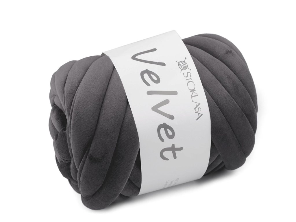 Silná příze Velvet je objemná, měkká a velmi příjemná na dotek. Tvoří ji tunýlek vyplněný vláknem. Dobře se vám s ní bude pracovat velkými jehlicemi nebo rukama.