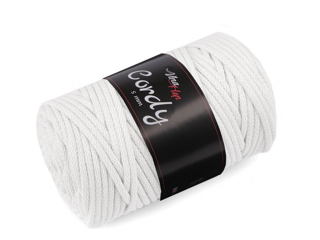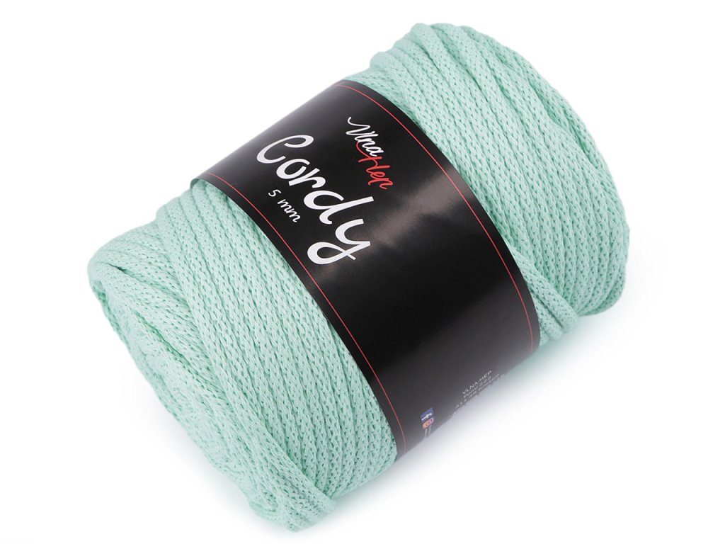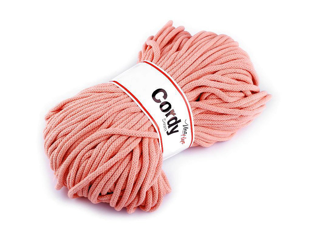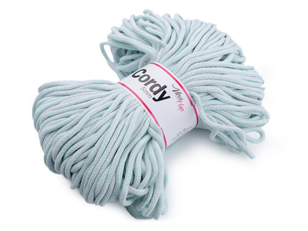 Provázkovou přízi Cordy tvoří tunýlek z bavlny, který je vyplněný polyesterovým vláknem. Je pevná a odolná, vhodná na pletení i háčkování. Využijete ji na výrobu pufů, košíků, koberečků, tašek, povlaků na polštáře, taburetů a jiných, převážně bytových, doplňků.