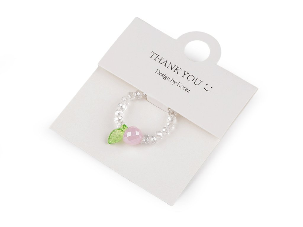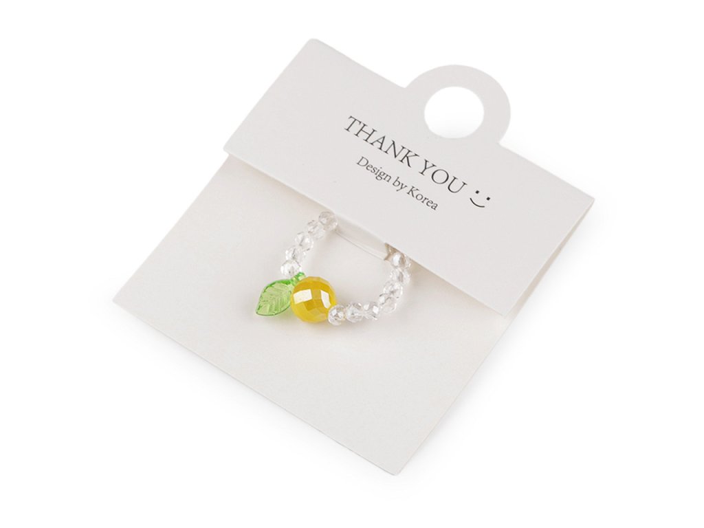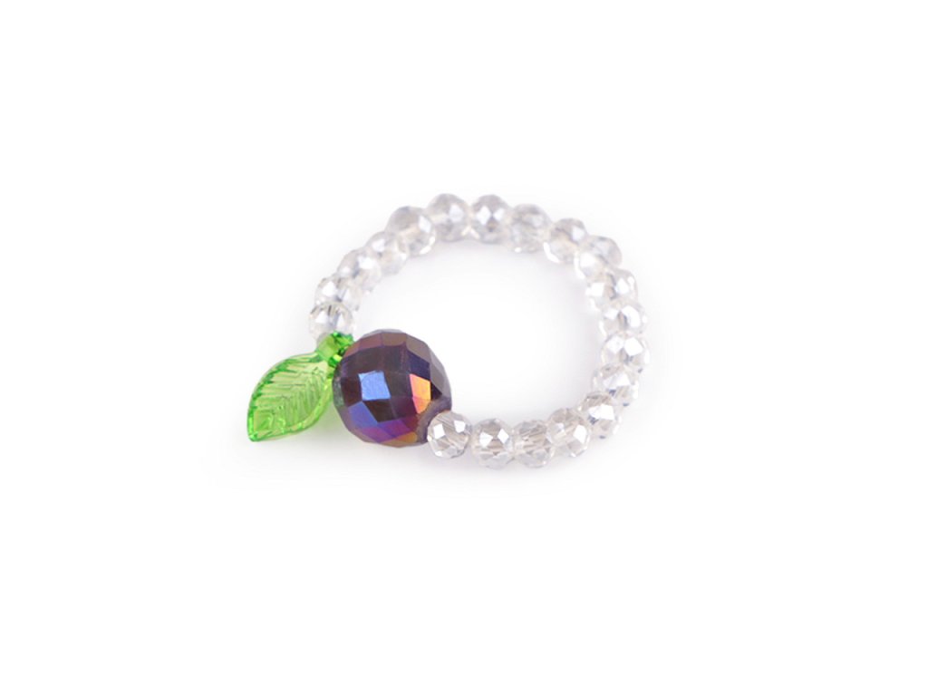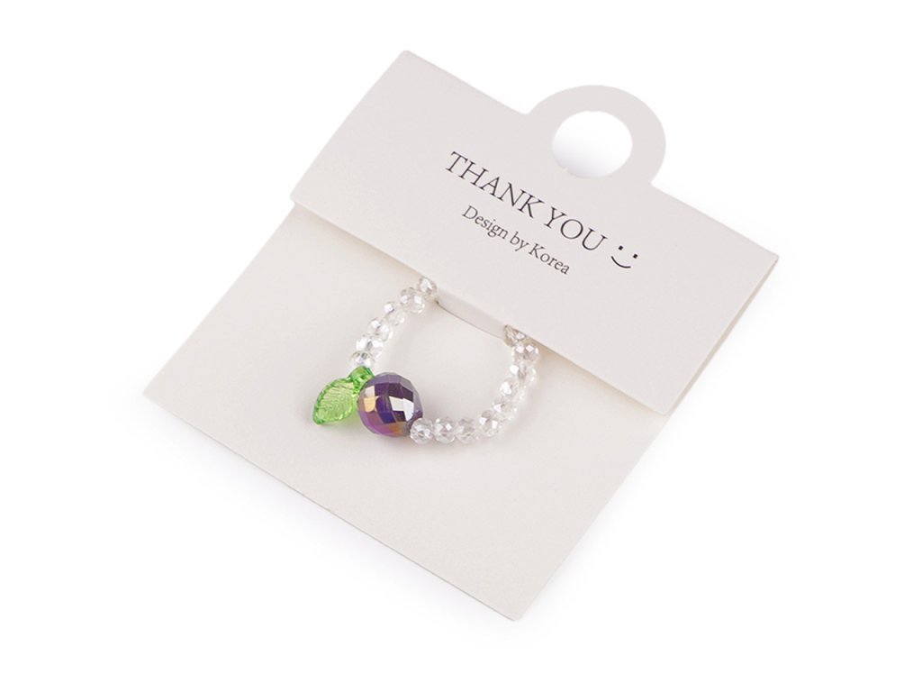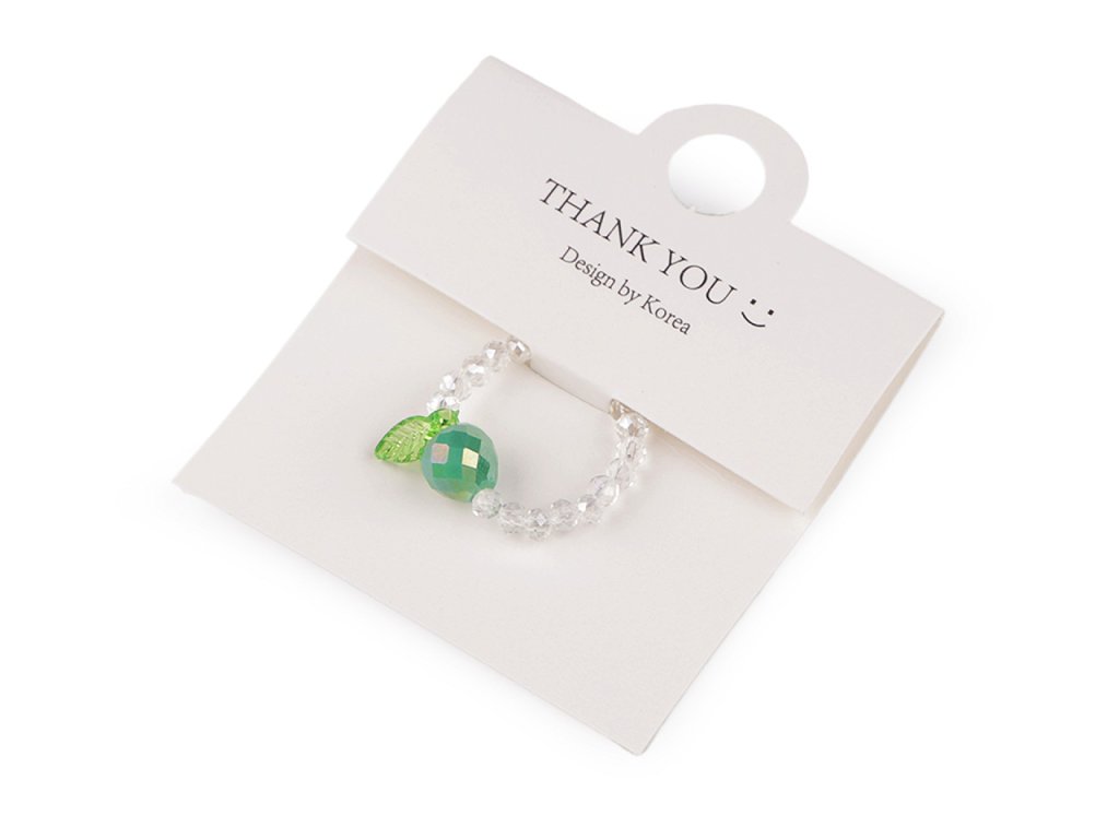 Prstýnek z broušených korálků s AB efektem má svěží design s motivem ovoce. Uprostřed je ozdobený větším broušeným korálkem s lístečkem. Na prstě je velmi příjemný a lehoučký. Díky silikonové pruženky je pružný, má univerzální velikost. Je umístěný na dárkové kartičce s nápisem Thank you, v transparentním sáčku. Bude skvělým doplňkem na letní festivaly, párty nebo jako dárek pro někoho blízkého.