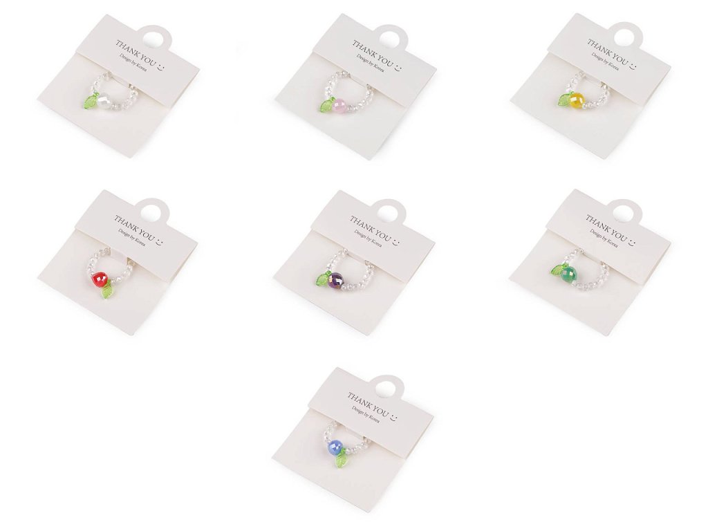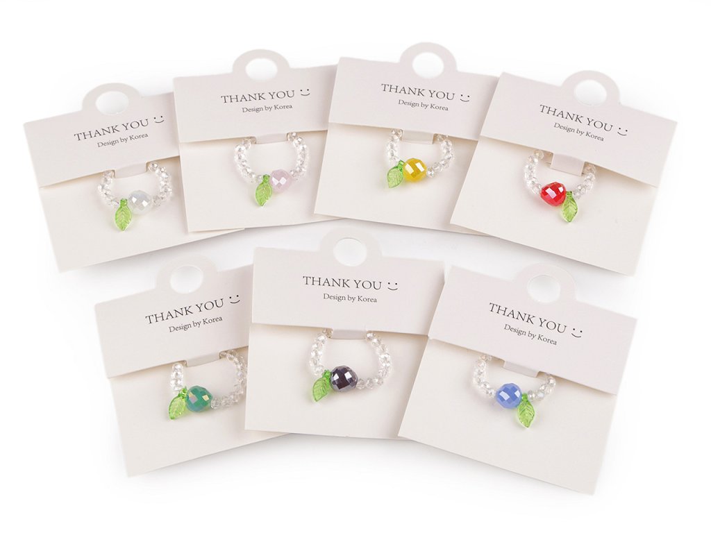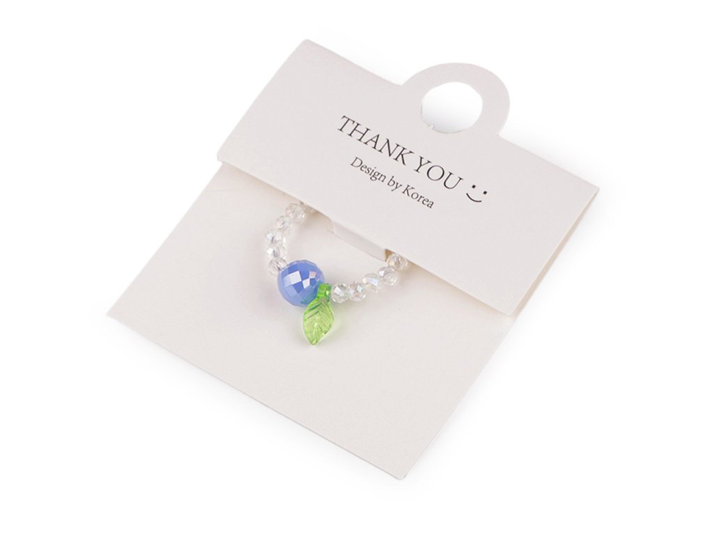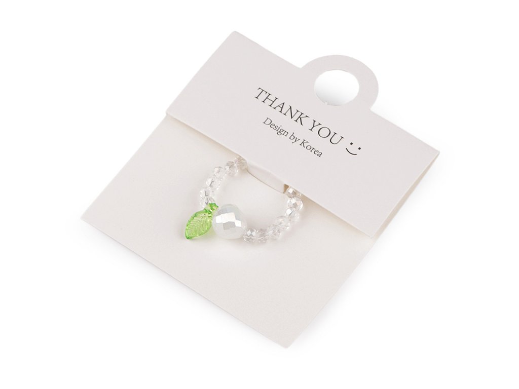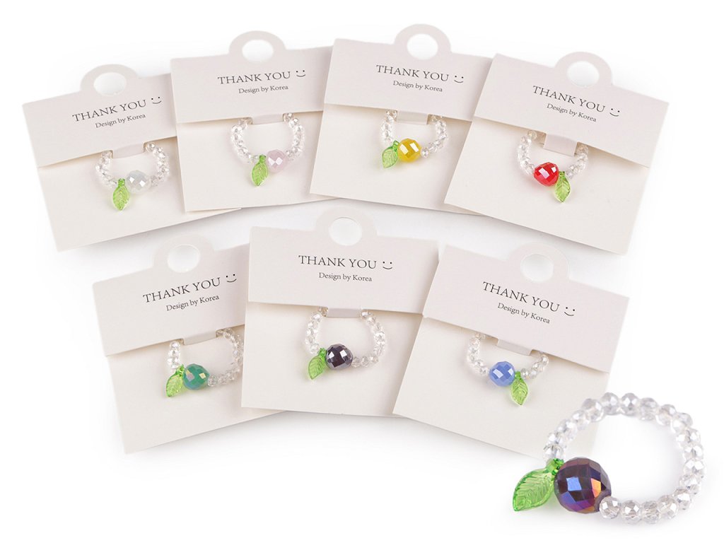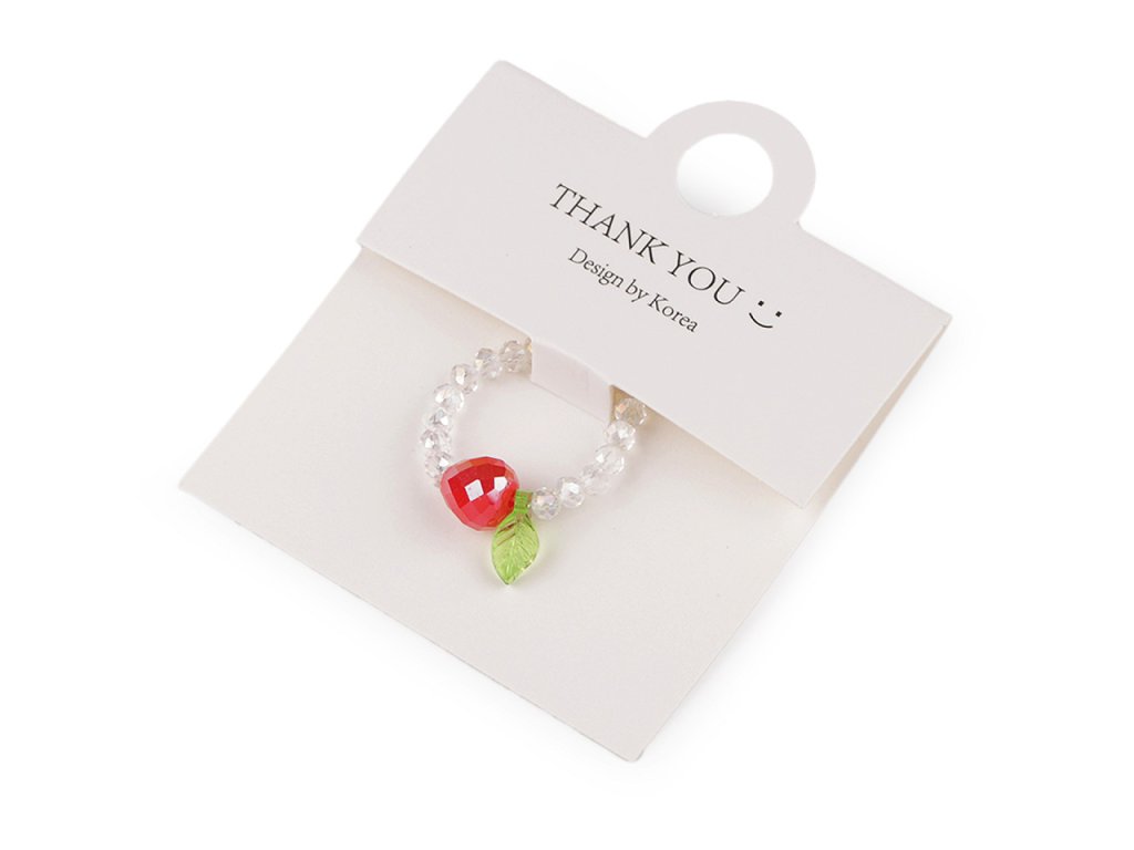 Prstýnek z broušených korálků s AB efektem má svěží design s motivem ovoce. Uprostřed je ozdobený větším broušeným korálkem s lístečkem. Na prstě je velmi příjemný a lehoučký. Díky silikonové pruženky je pružný, má univerzální velikost. Je umístěný na dárkové kartičce s nápisem Thank you, v transparentním sáčku. Bude skvělým doplňkem na letní festivaly, párty nebo jako dárek pro někoho blízkého.