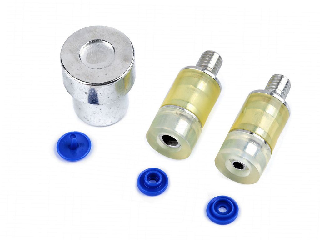 Sada pistonů je určená k nýtování plastových patentek, které najdete pod kódy 080646, 080647, 080648, 890160. Používá se tak, že větší část pistonu umístíme v dolní části lisu a vložíme látku s patentkou. Druhou část zašroubujeme do horní části lisu.