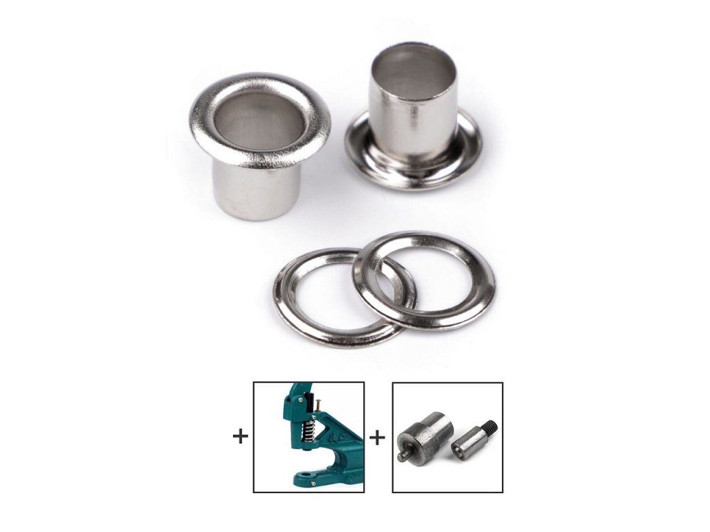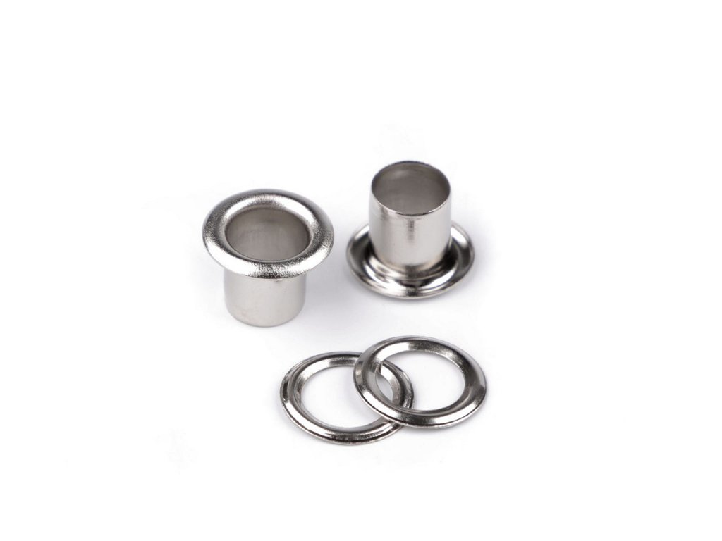 Průchodka umožňuje provlečení šňůry nebo gumy - zpevňuje dírky v materiálu. Využijete ji při výrobě a zdobení tašek, kabelek nebo batohů. Skládá se ze dvou částí. Při styku s vodou může rezivět.