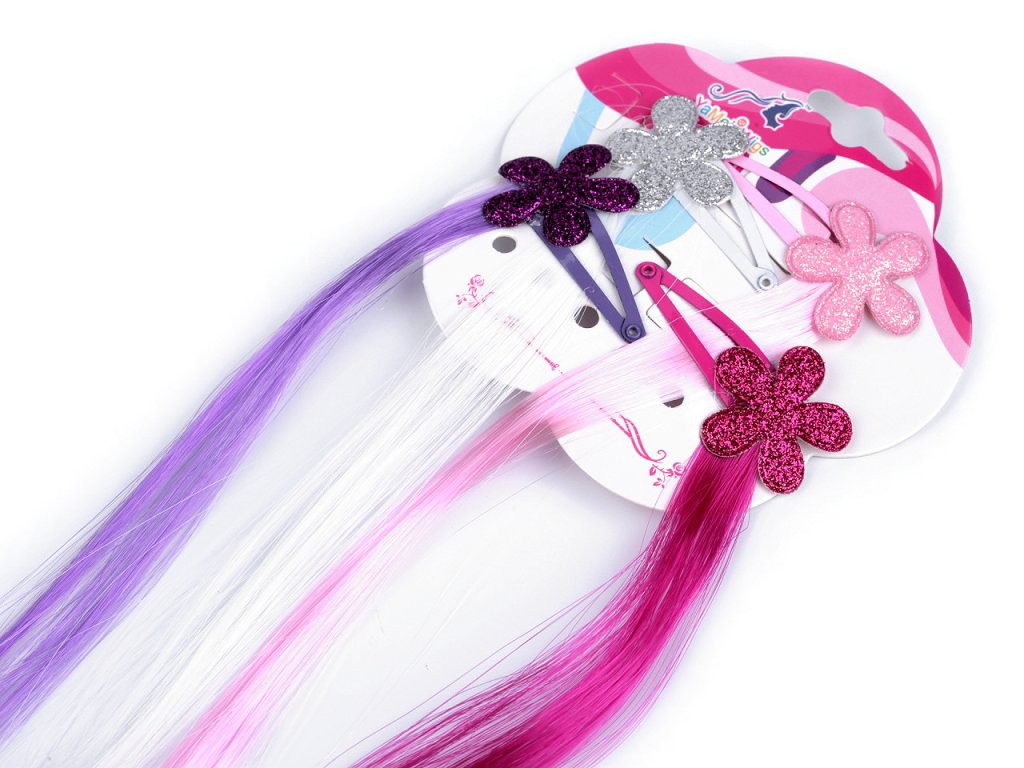 Sada barevných pramínků na pukačce potěší především malé holčičky. Jsou ozdobené textilními ozdobami s glitry, díky kterým se působivě třpytí. Pramínky skvěle oživí účes. Při dětské hře na princezny jsou neocenitelným doplňkem.