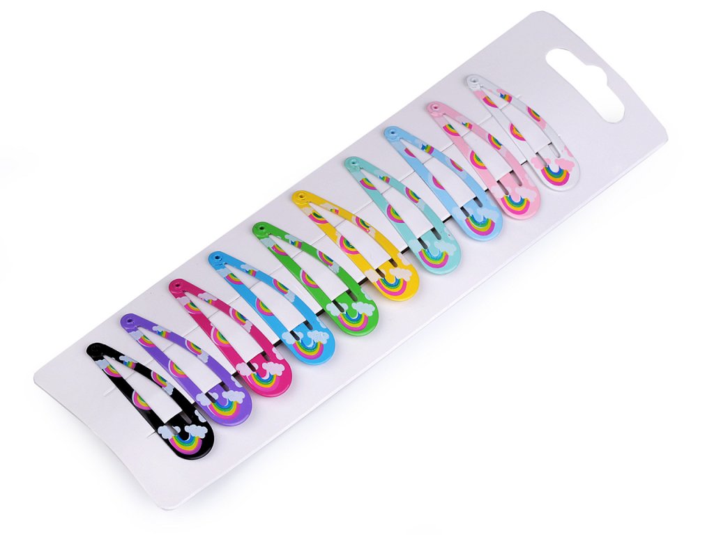 Mix barevných sponek s potiskem ocení všechny malé parádnice. Jsou vyrobené z kvalitního materiálu, který dlouho drží svůj tvar, funkčnost i barvy. Sponky jsou umístěné na papírové kartě s výsekem pro zavěšení a vystavení sponek.