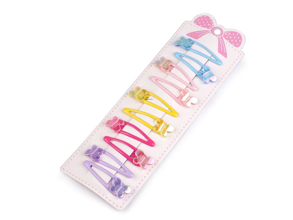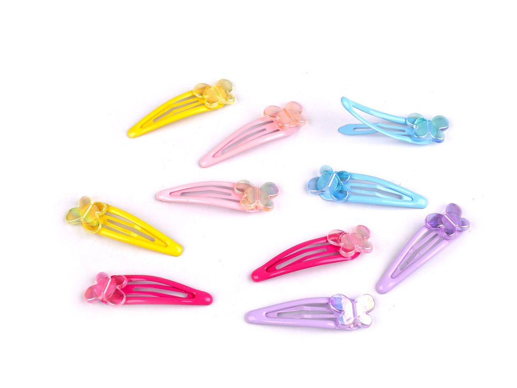 Pukačky s ozdobou motýlka poutavě ozdobí účes malých i větších parádnic. Motýl má povrchovou úpravu s AB efektem. Sponky jsou pevné, vyrobené z kvalitního materiálu, který dlouho drží svůj tvar, funkčnost i barvy.