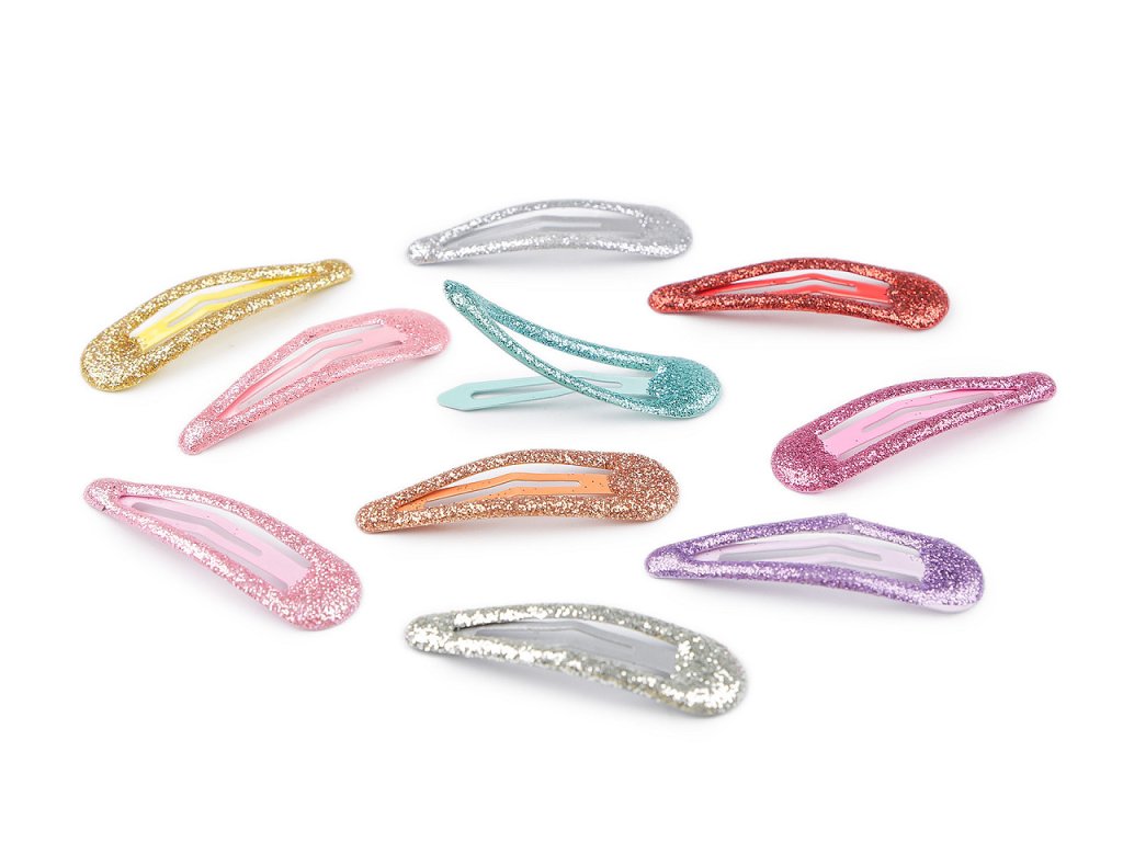 Mix různě barevných sponek pukaček s glitry ocení malé i větší slečny, které se rády blýsknou. Sponky jsou vyrobené z kvalitního materiálu, který dlouho drží svůj tvar, funkčnost i barvy. Glitry neopadávají, pevně drží.